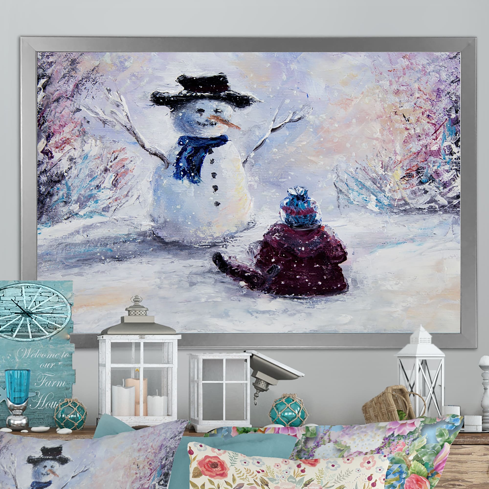 Designart "Christmas Snowman And Child" Traditional Framed Wall Art