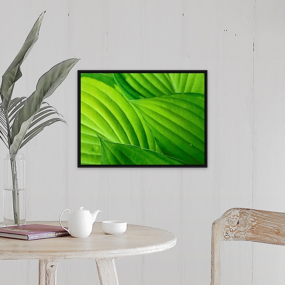 "Bright green hosta leaves, clearly showing veins and leaf shapes." Black Float Frame Canvas Art