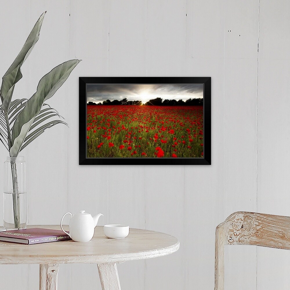 "Sun sets over poppy field, sun showing burst of rays against stormy sky." Black Framed Print