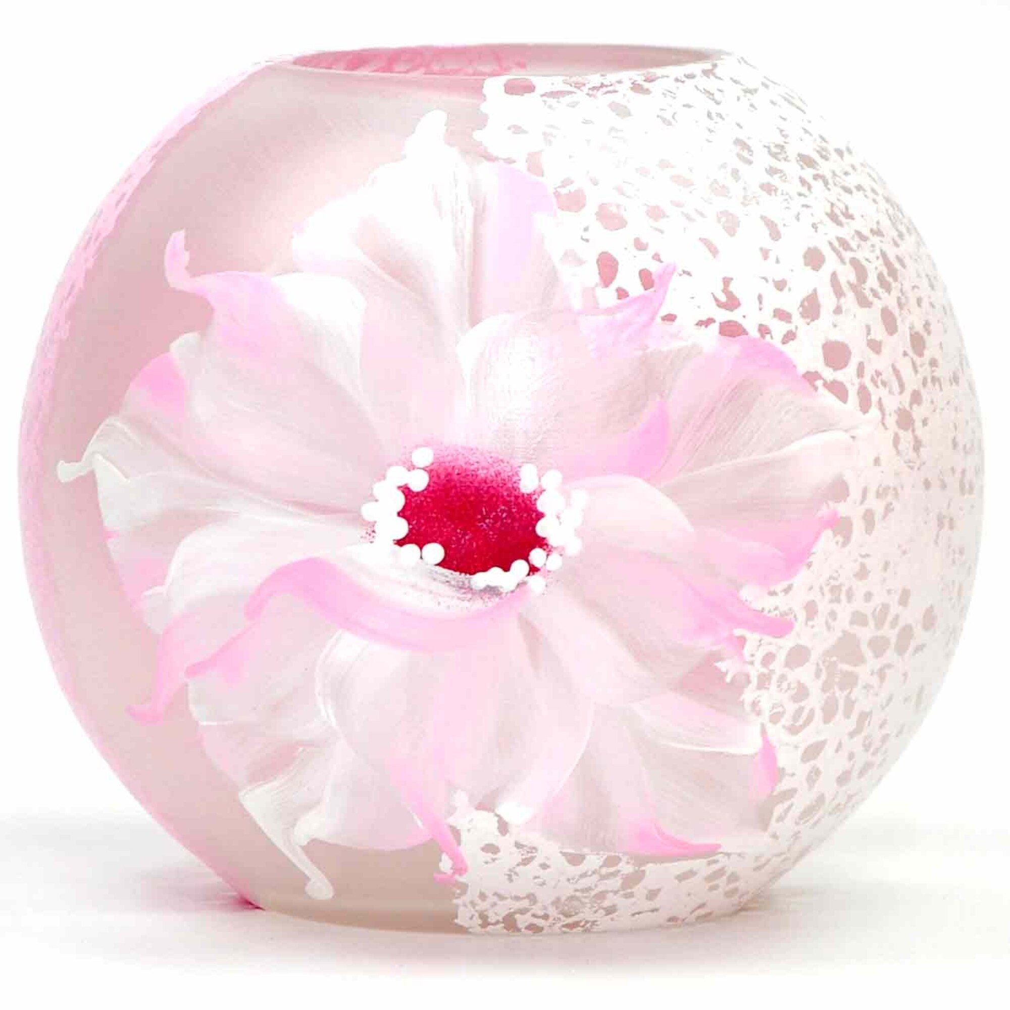 7" Pink and White Floral Round Glass Vase