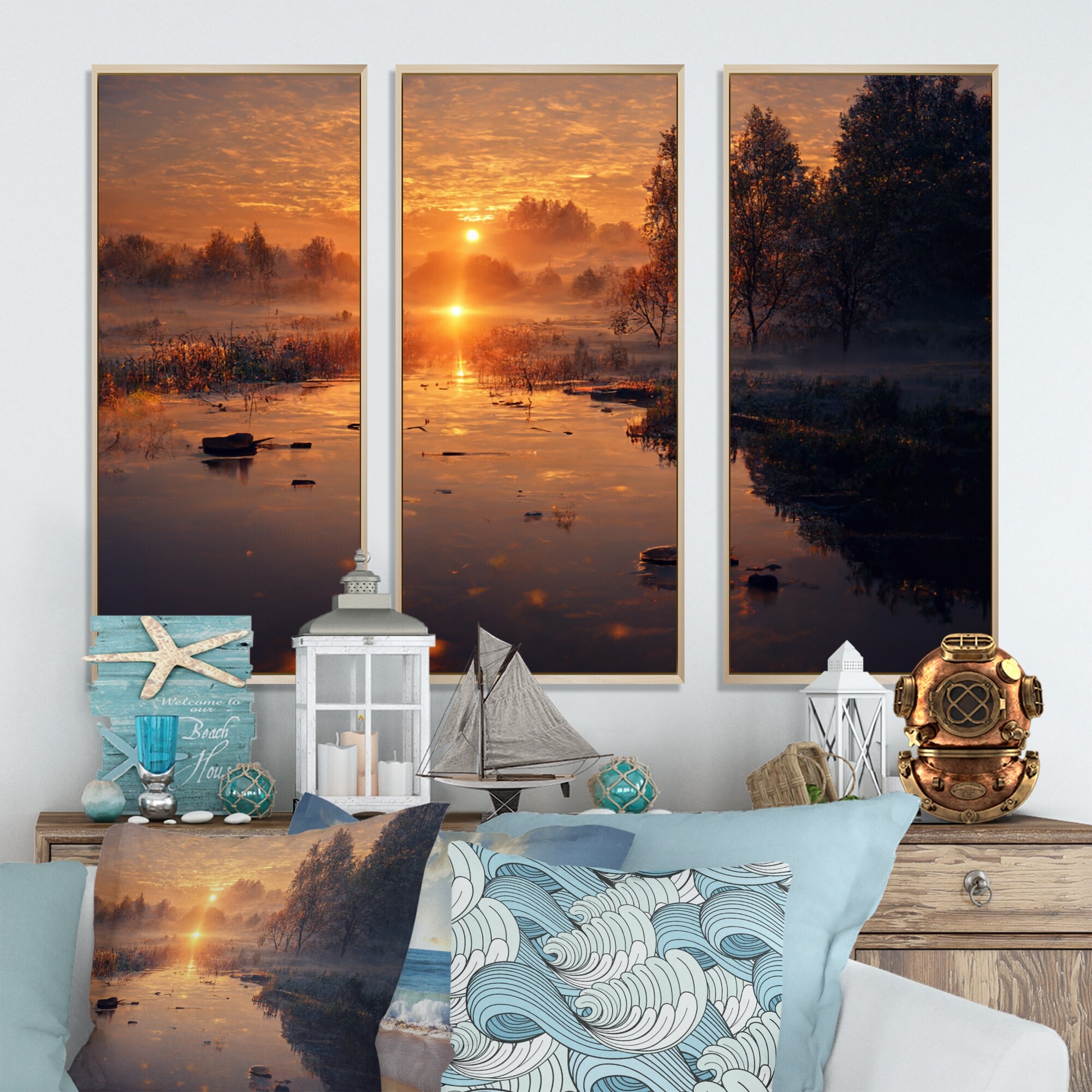 Designart "Morning Fog Over the Lake Sunset VII" Landscape Lake Framed Canvas Wall Art Print - 3 Panels