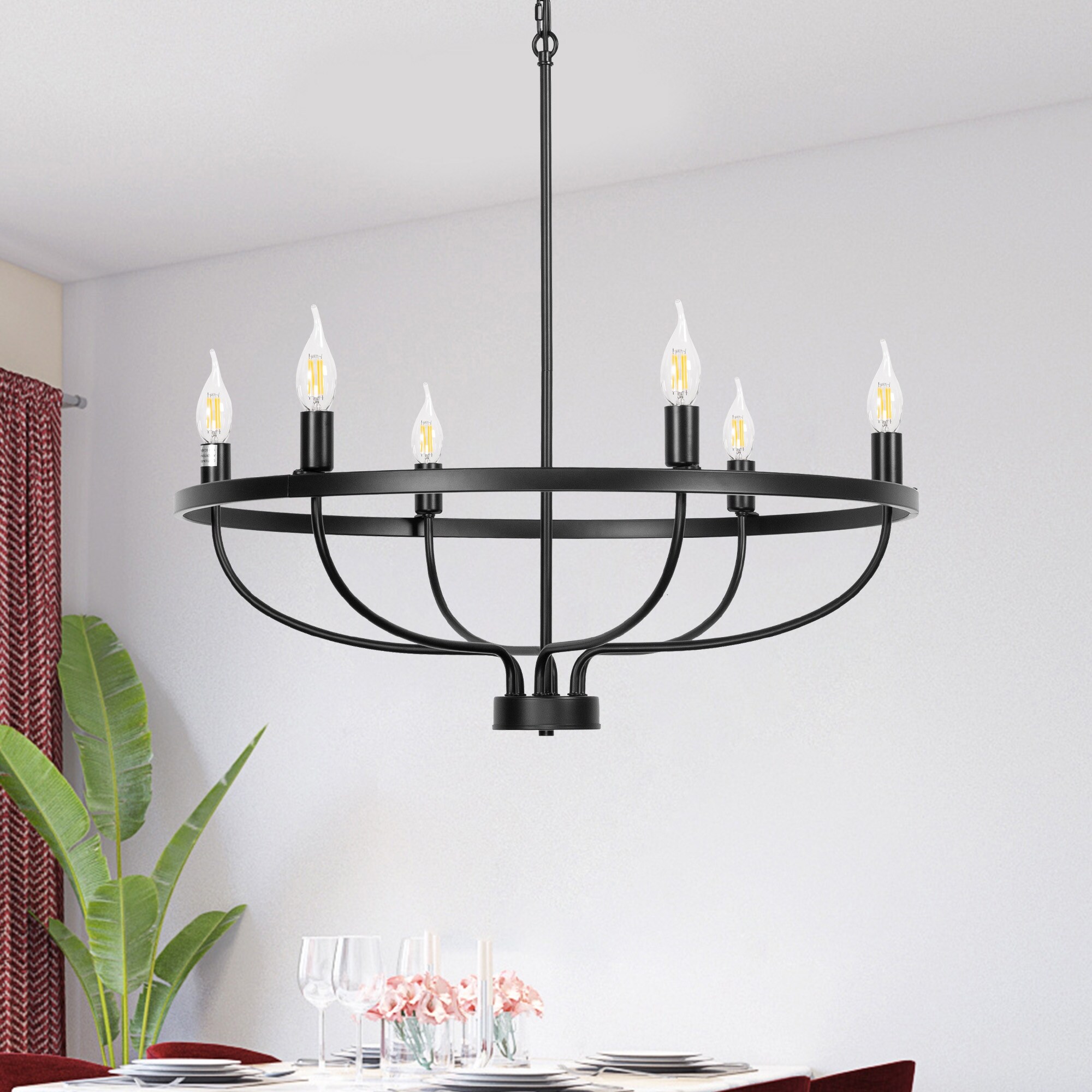 YANSUN 28.54 in. 6-Light Black Wagon Wheel Pendant Linght Vintage Farmhouse Industrial Candle Chandelier for Dining Room Hallway