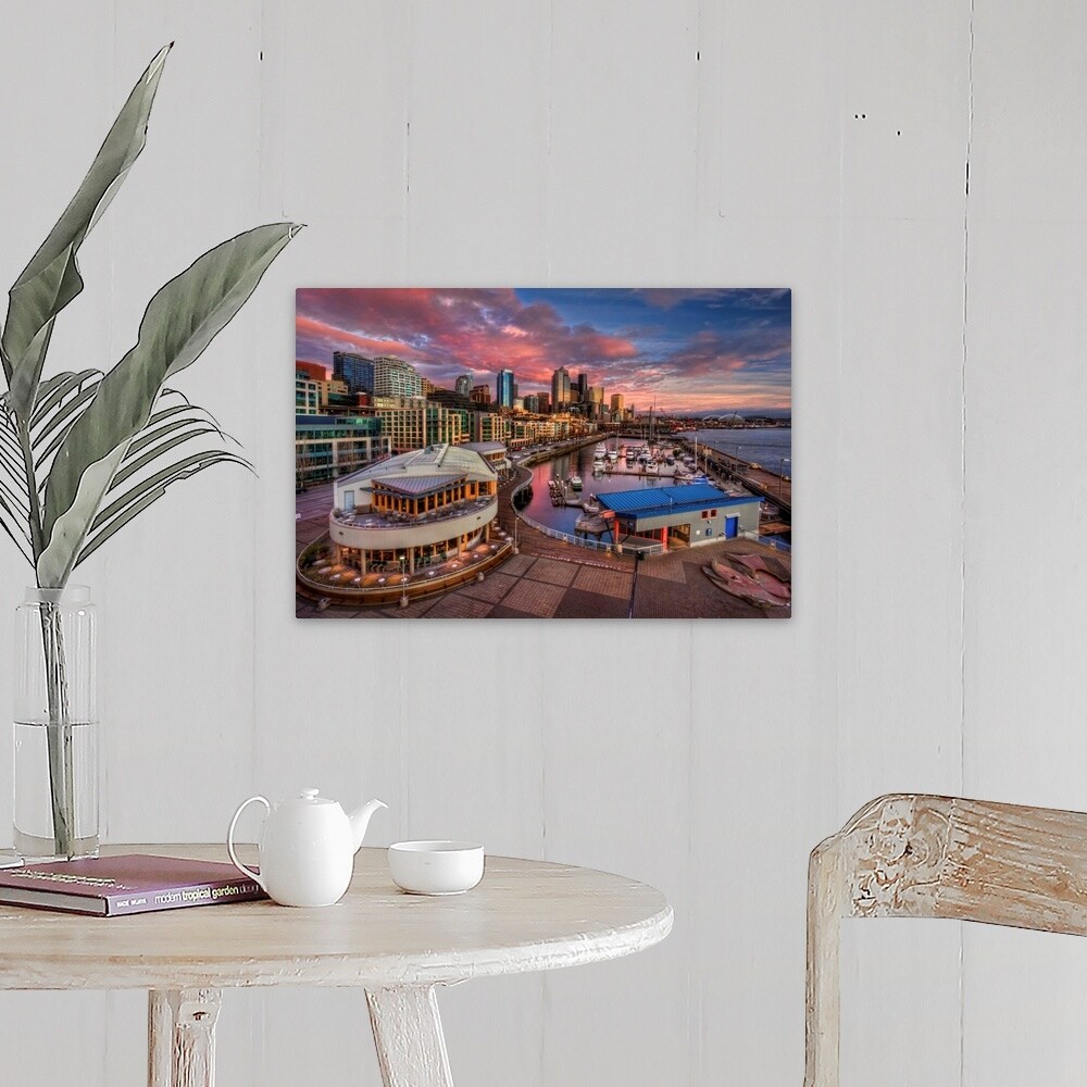 "Waterfront at Downtown Seattle Sunset, Marina, Pacific Northwest." Canvas Wall Art