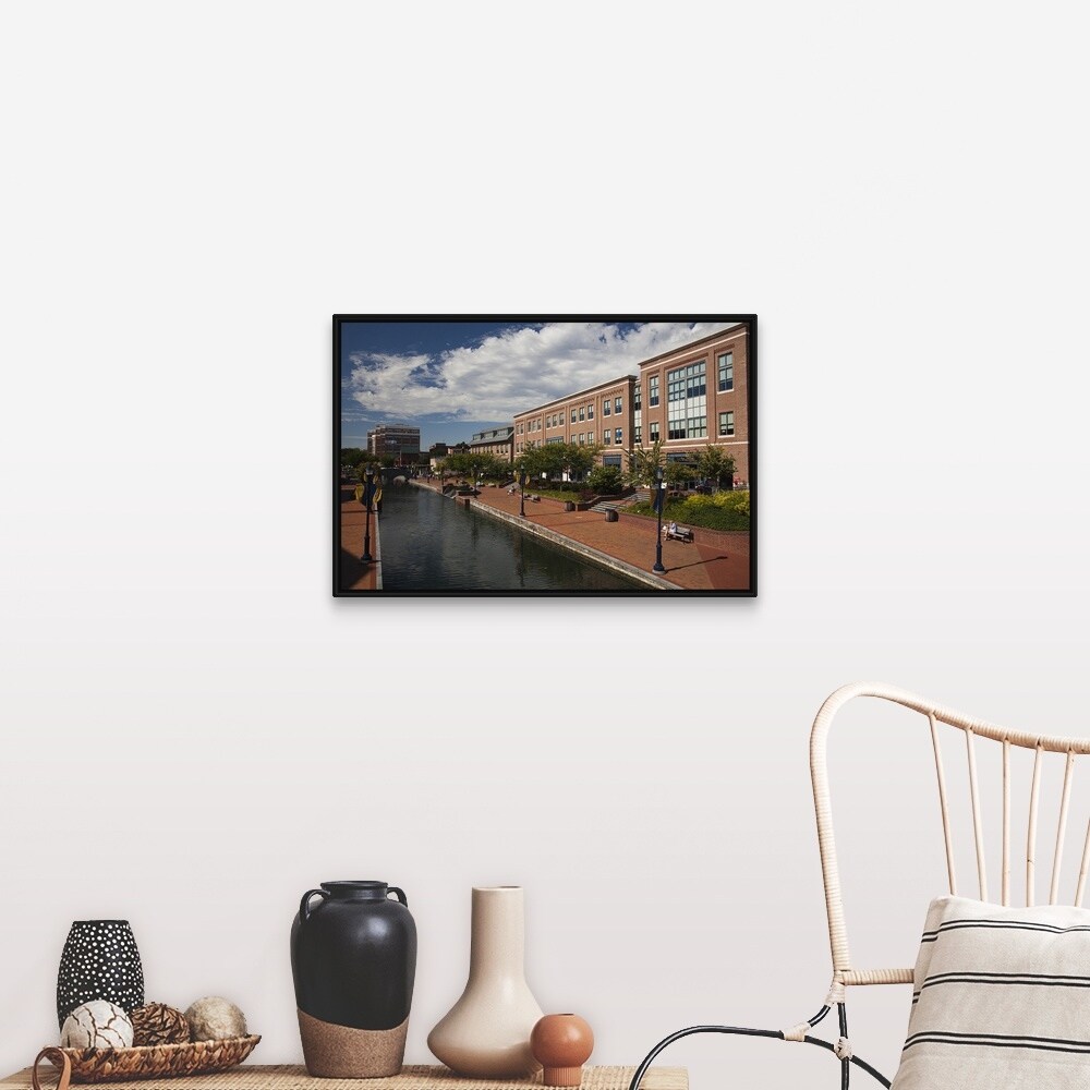 "Buildings at the waterfront, Carroll Creek Park, Frederick, Frederick County," Black Float Frame Canvas Art