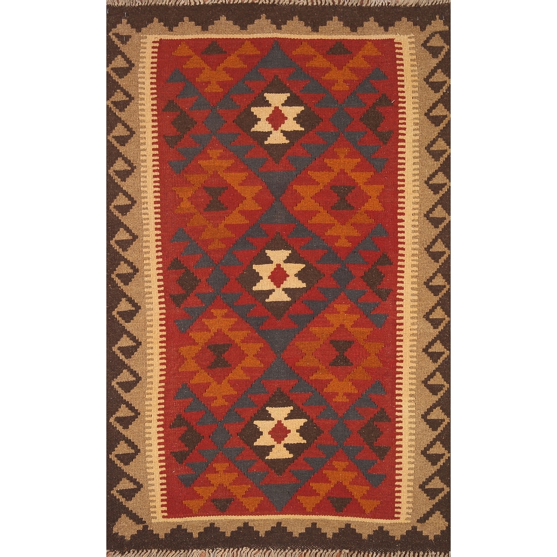 Red Geometric Kilim Oriental Area Rug Flat-weave Wool Carpet - 3'1" x 5'0"