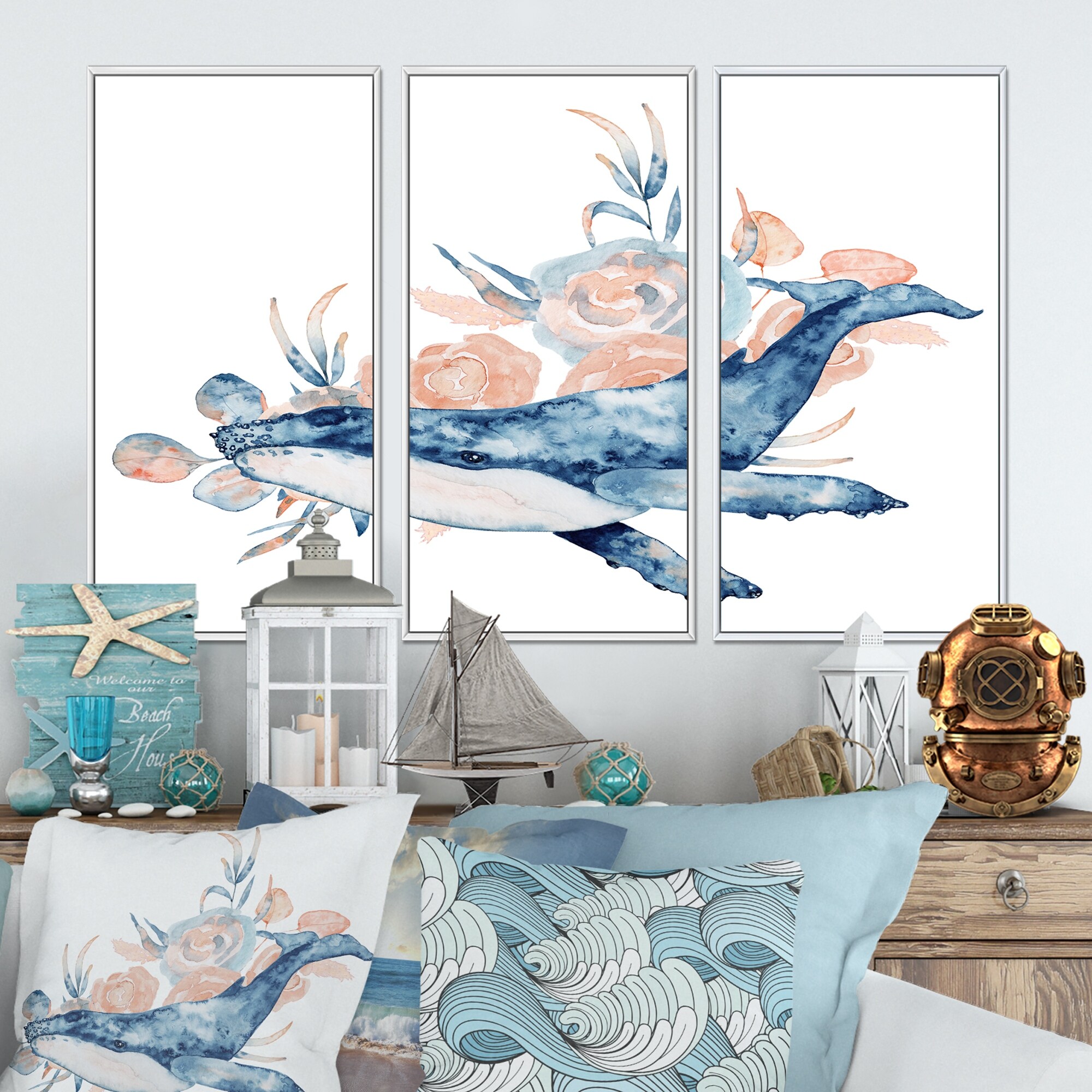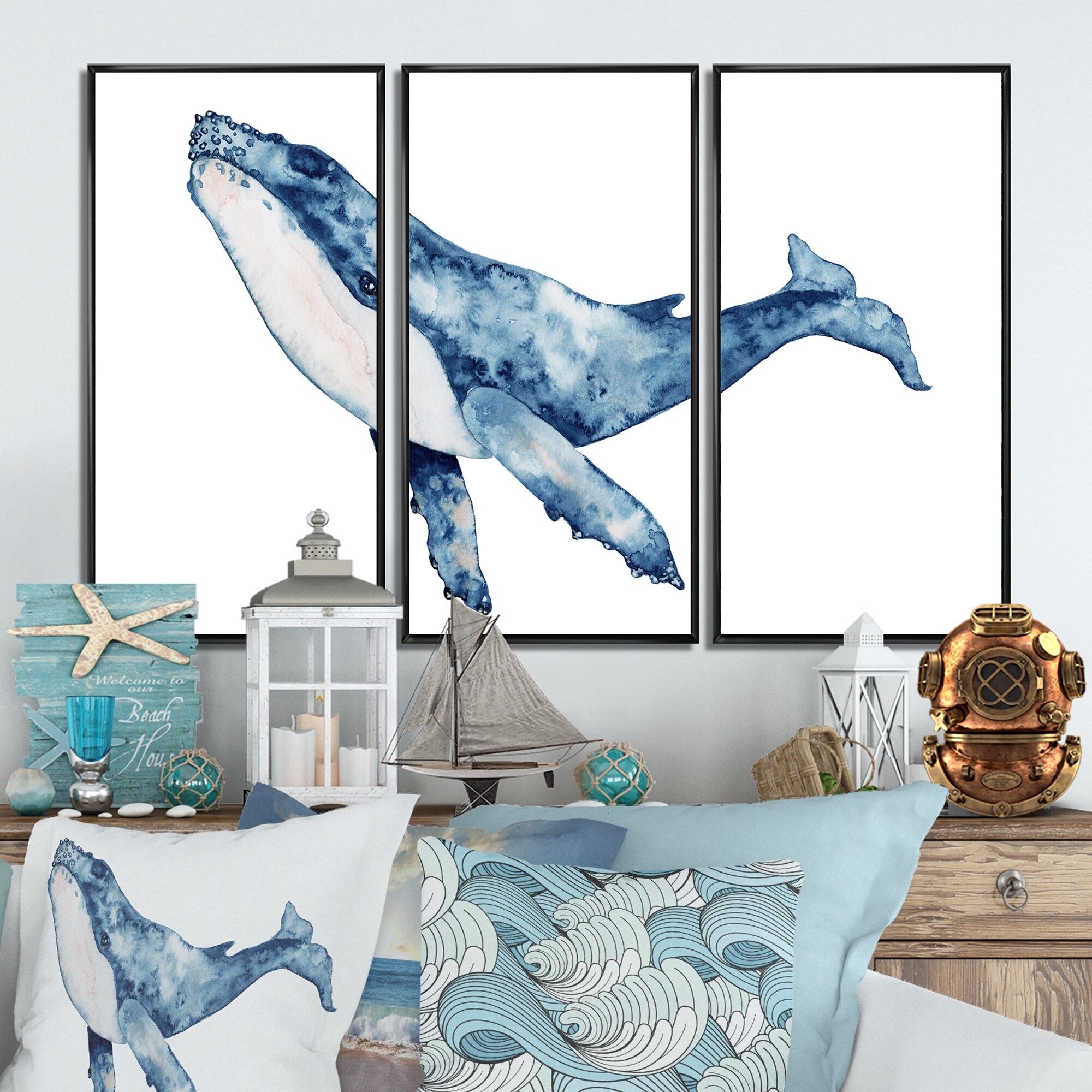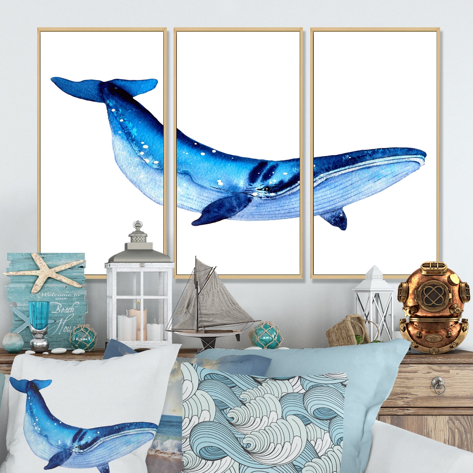 Designart "Blue Whale on White II" Nautical & Coastal Framed Canvas Wall Art Set of 3 - 4 Colors of Frames