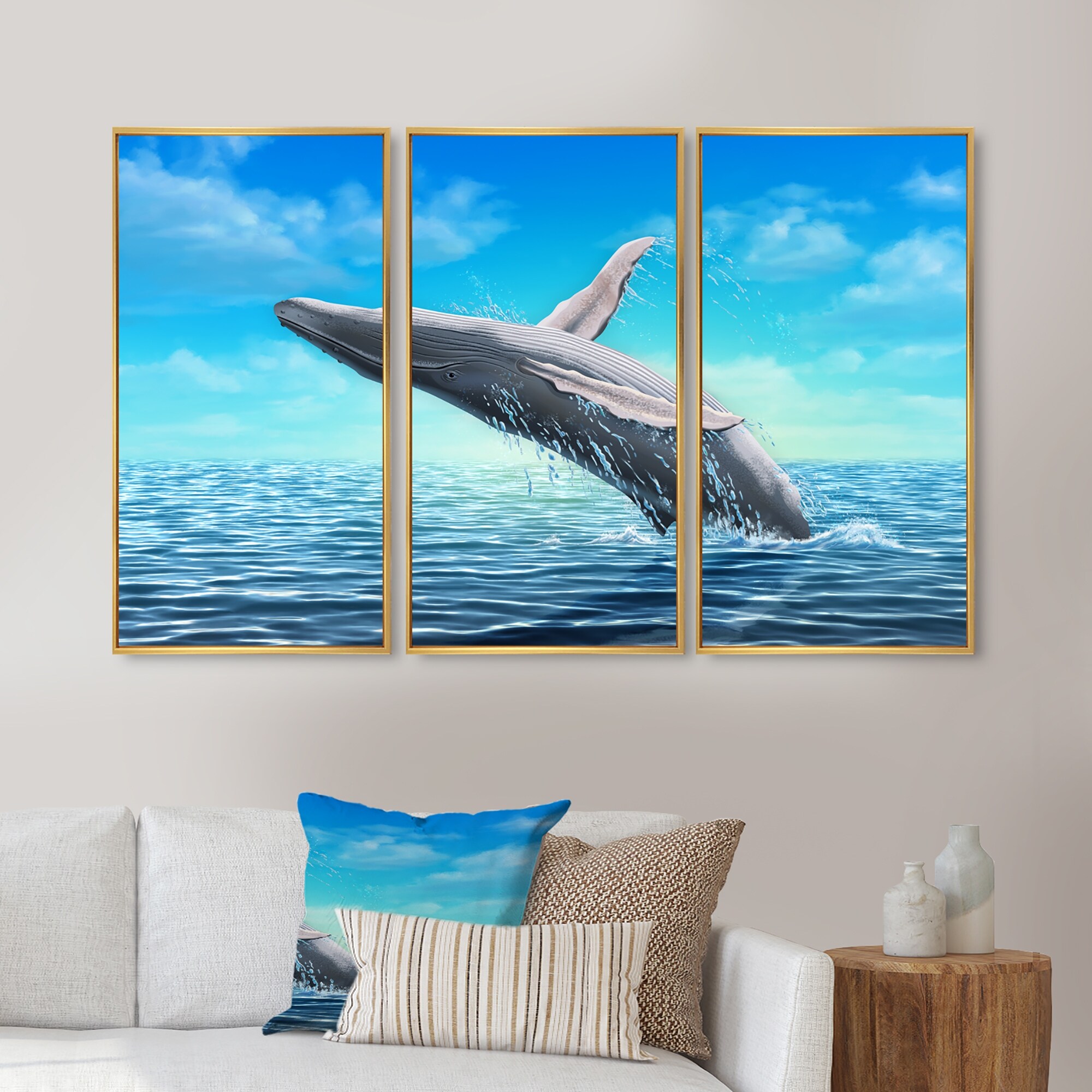 Designart "Humpback Whale Jumping" Farmhouse Framed Canvas Wall Art Print Set of 3 - 4 Colors of Frames