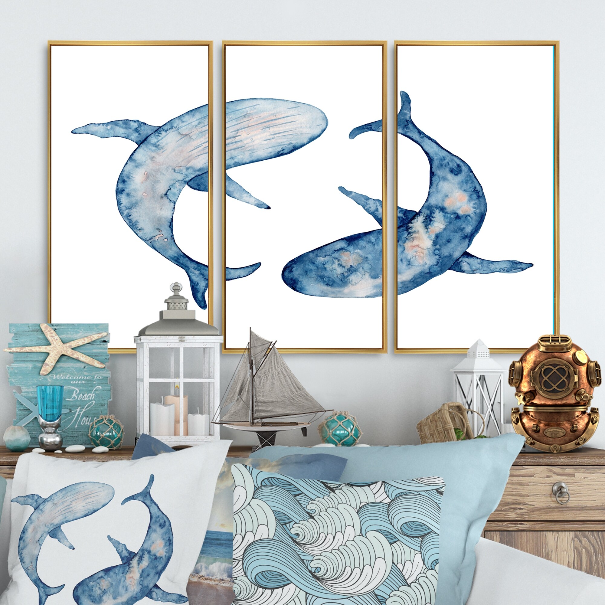 Designart "Blue Whales Watercolor Illustration on White" Nautical & Coastal Framed Art Prints Set of 3 - 4 Colors of Frames