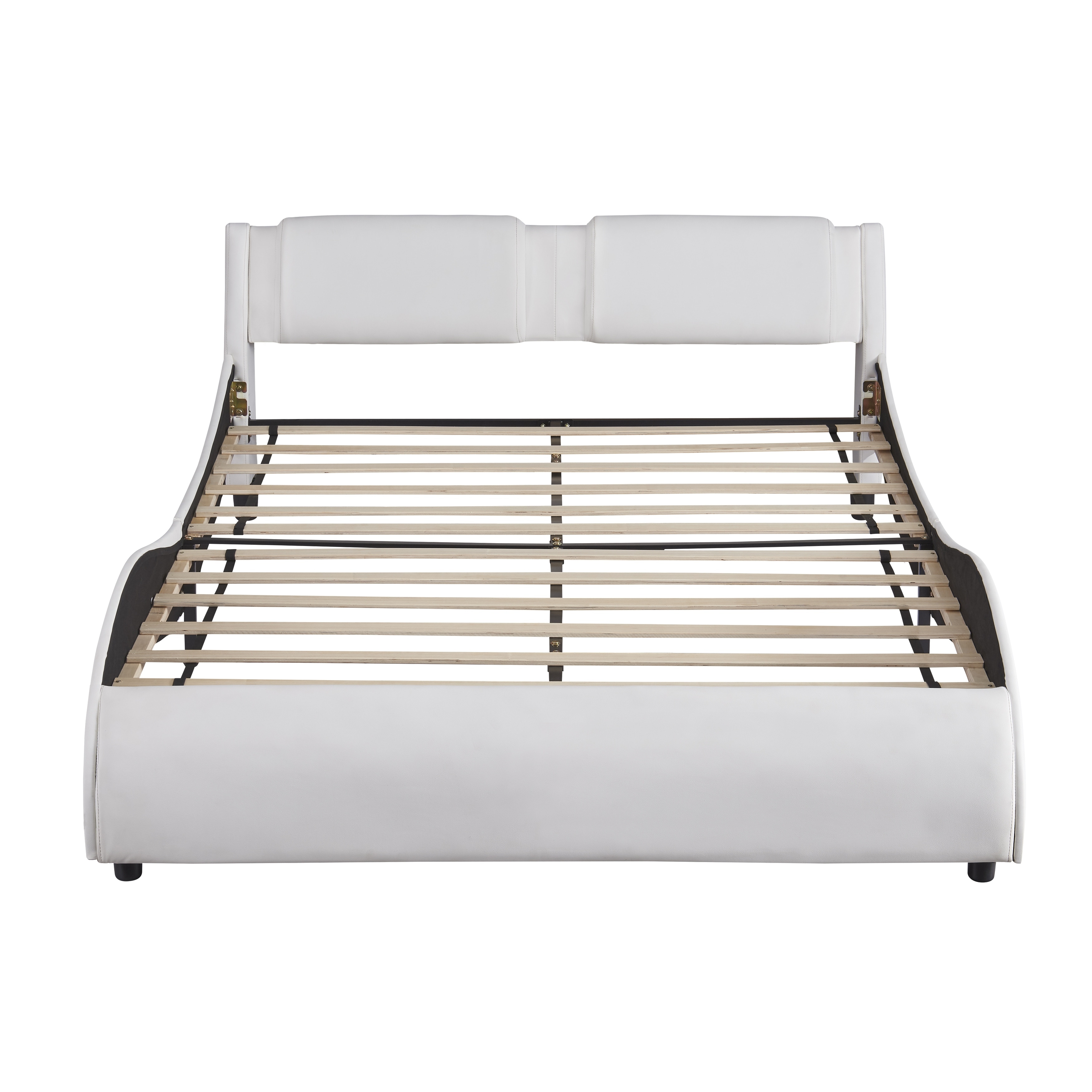 White Queen Size Upholstered Faux Leather Platform Bed with LED Light Bed Frame with Slatted
