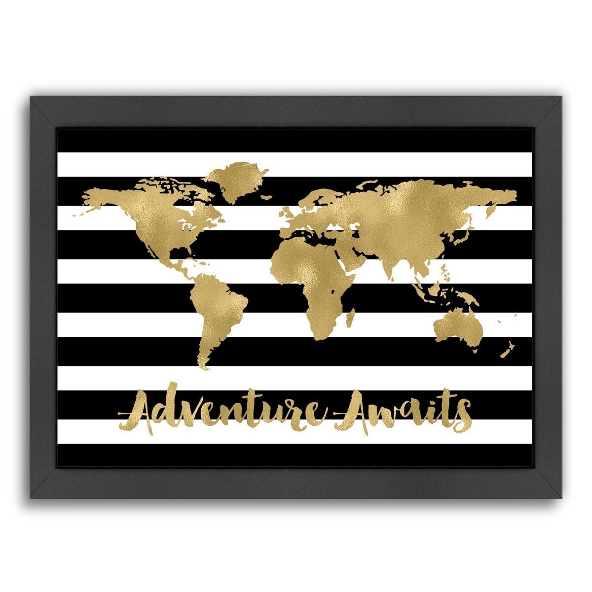 World Map Black White Stripe Adventure Awaits - Framed Print Wall Art