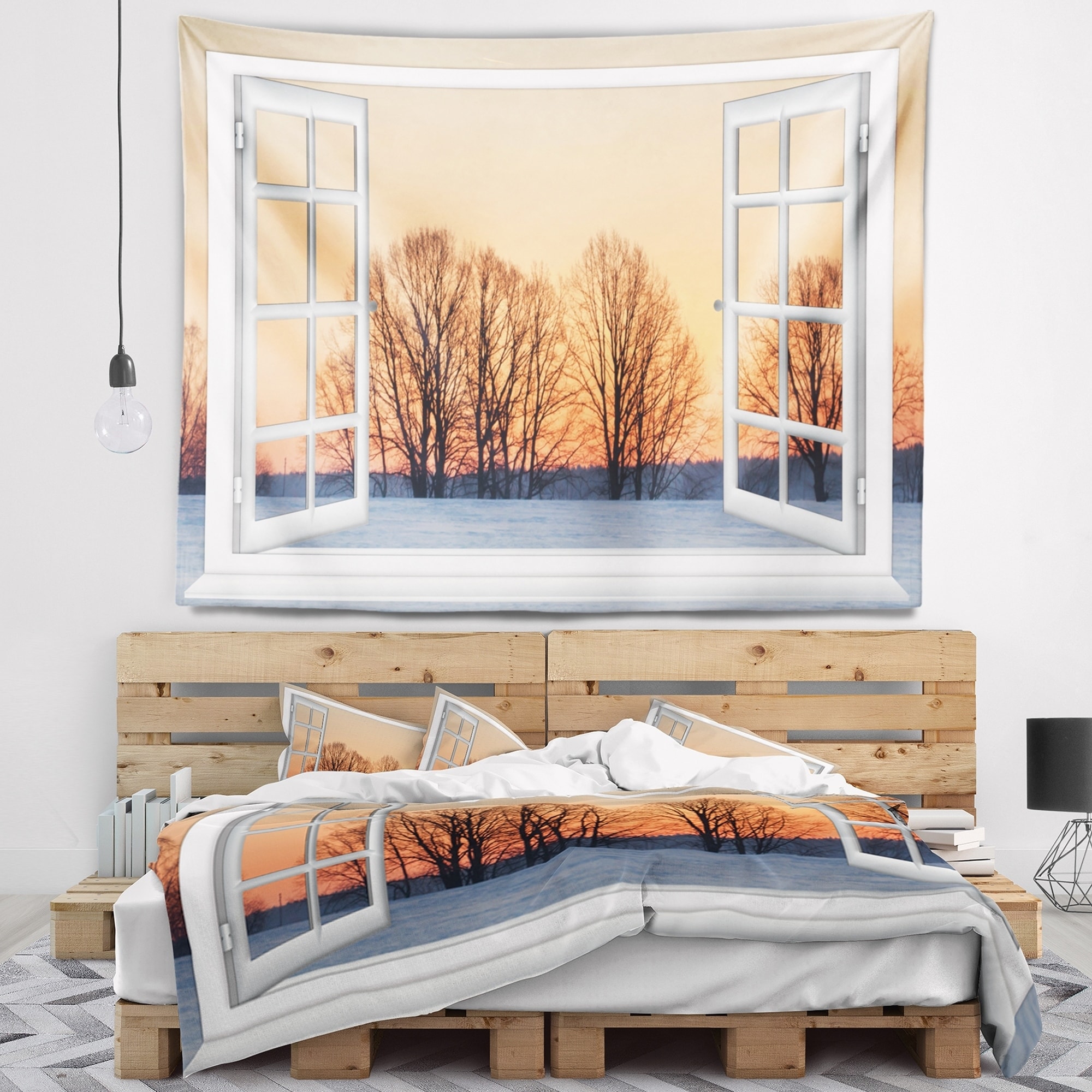 Designart 'Open Window to Snowy Sunset' Landscape Wall Tapestry
