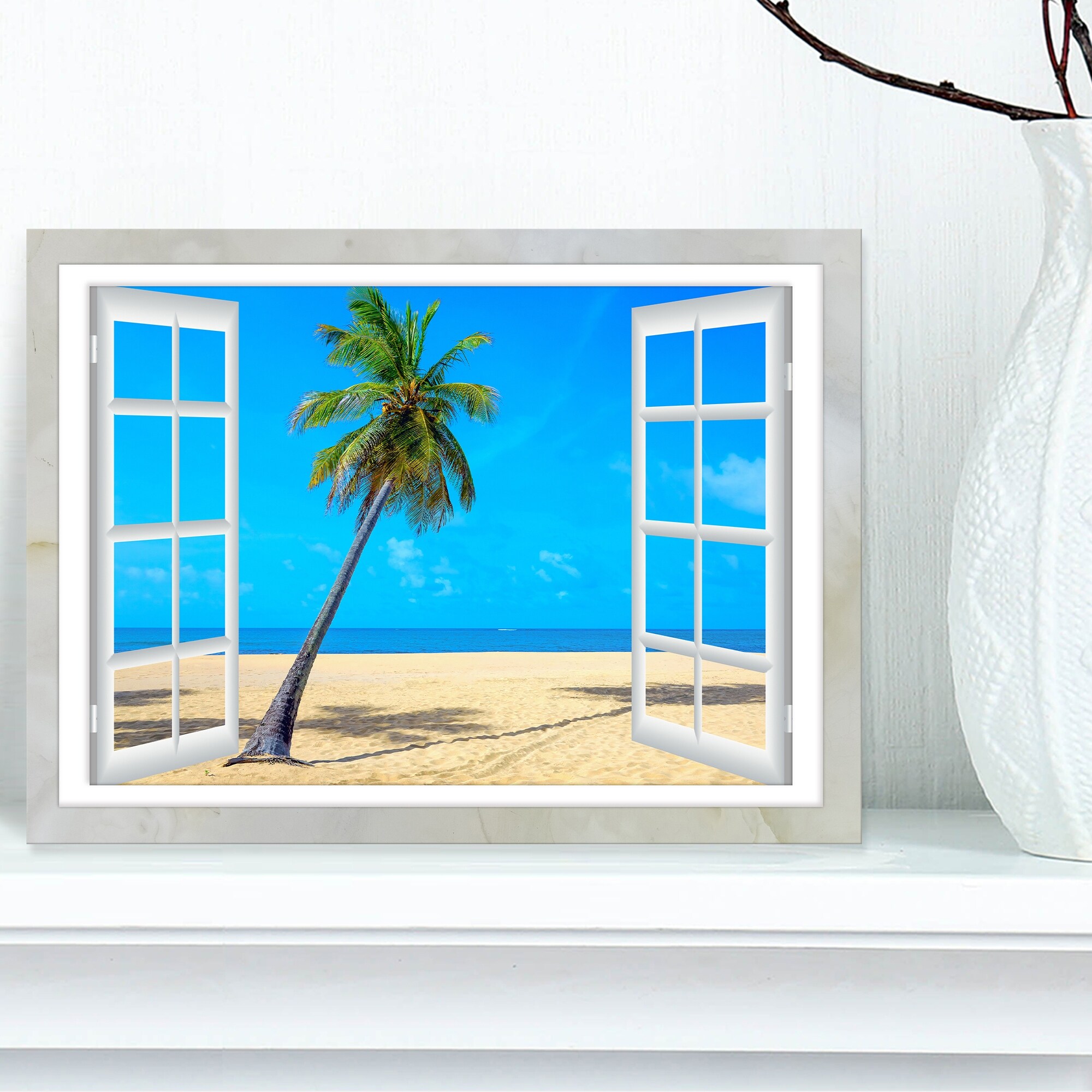 Open Window to Beach with Palm - Extra Large Seashore Glossy Metal Wall Art