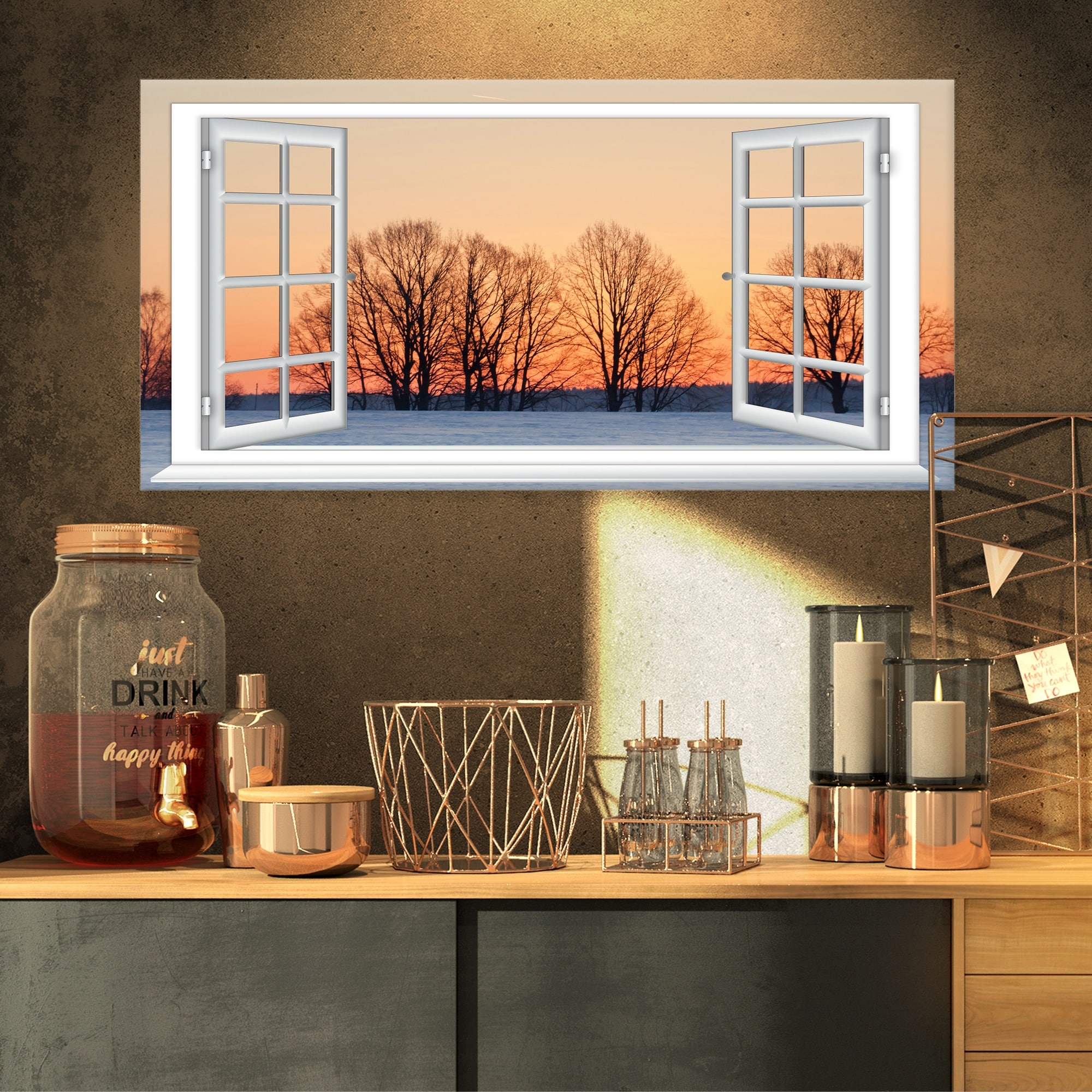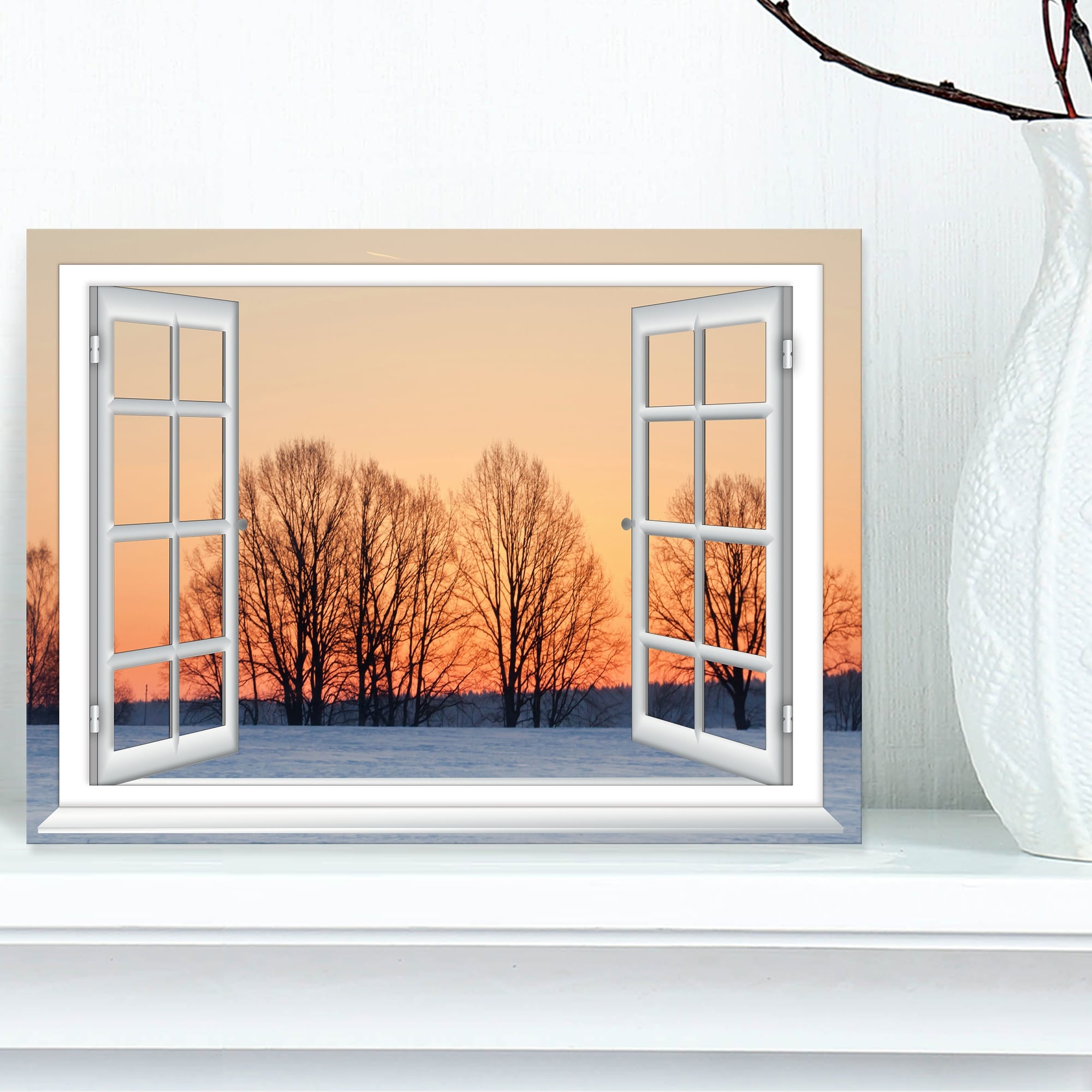 Designart "Open Window to Snowy Sunset" Landscape Canvas Art Print