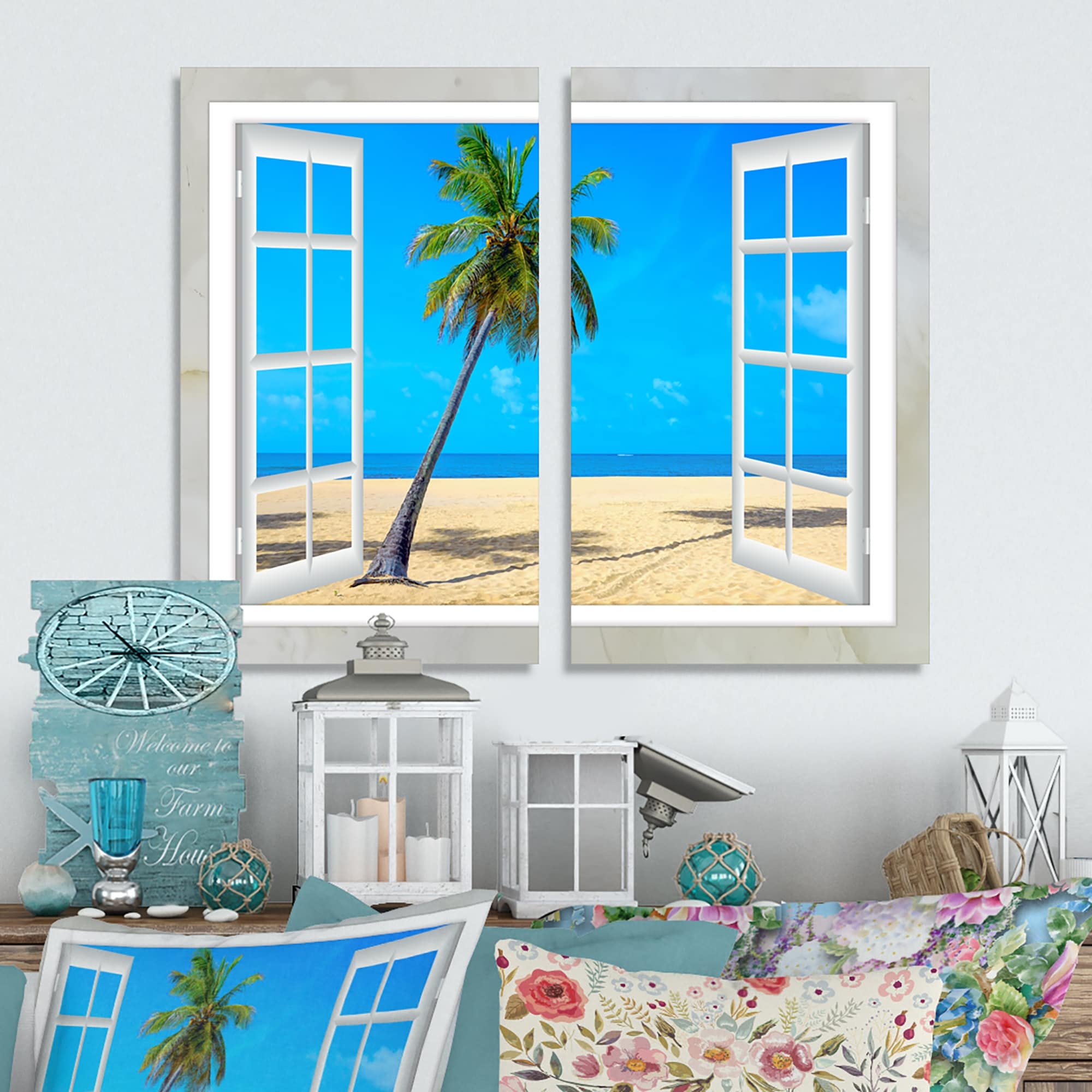 Designart "Open Window to Beach with Palm" Seashore Canvas Wall Art Print 2 Piece Set