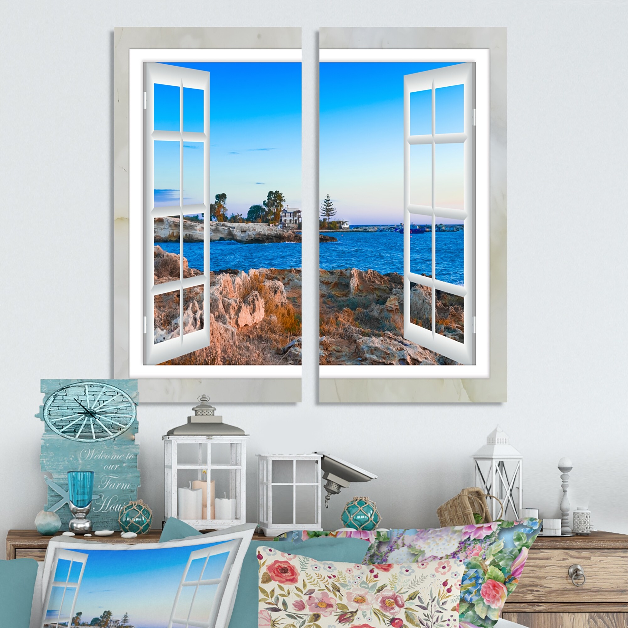 Designart "Open Window to Blue Seashore" Landscape Canvas Wall Art Print 2 Piece Set