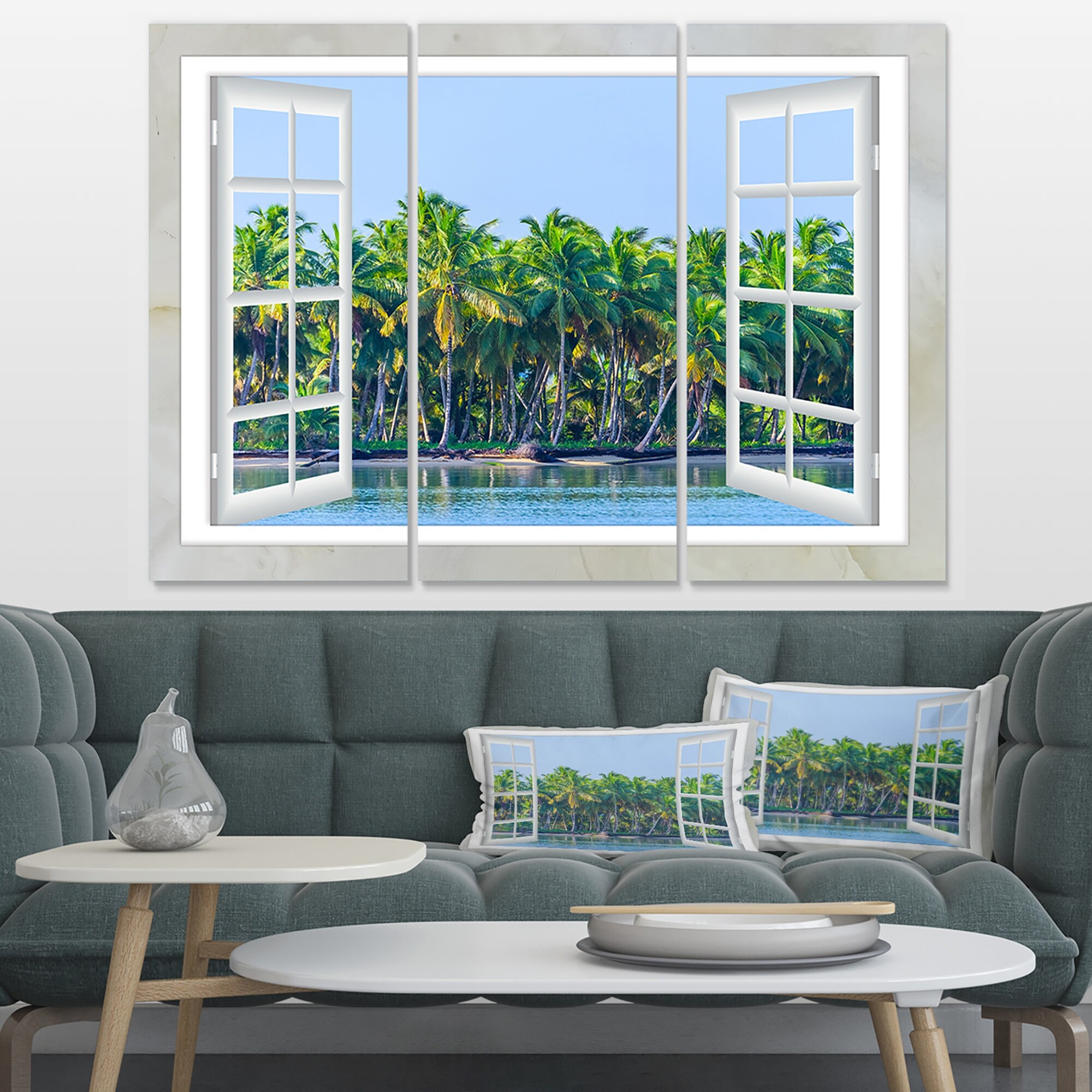 Designart "Open Window to Seashore Palms" Extra Large Seashore Canvas Art - 36x28 - 3 Panels