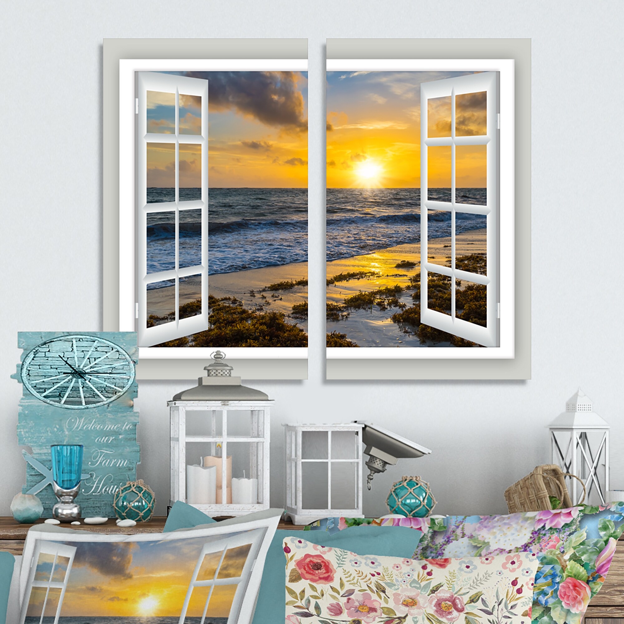 Designart "Open Window to Bright Yellow Sunset" Modern Seascape Canvas Wall Art Print 2 Piece Set