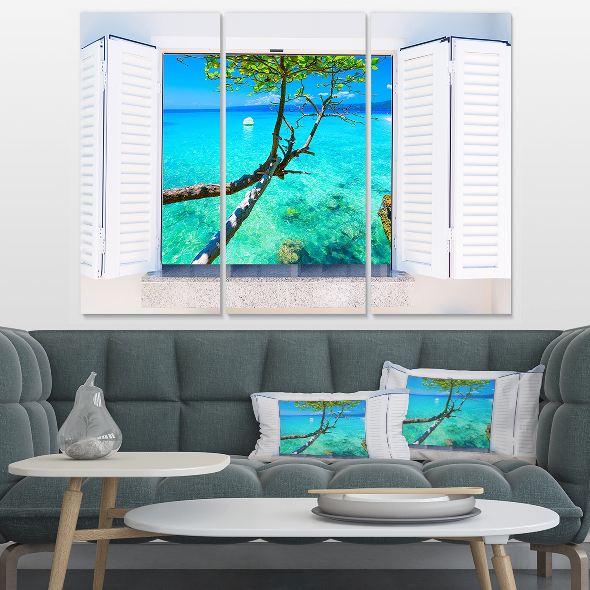 Designart "Open Window to Gorgeous Seashore" Modern Seascape Canvas Artwork - 36x28 - 3 Panels