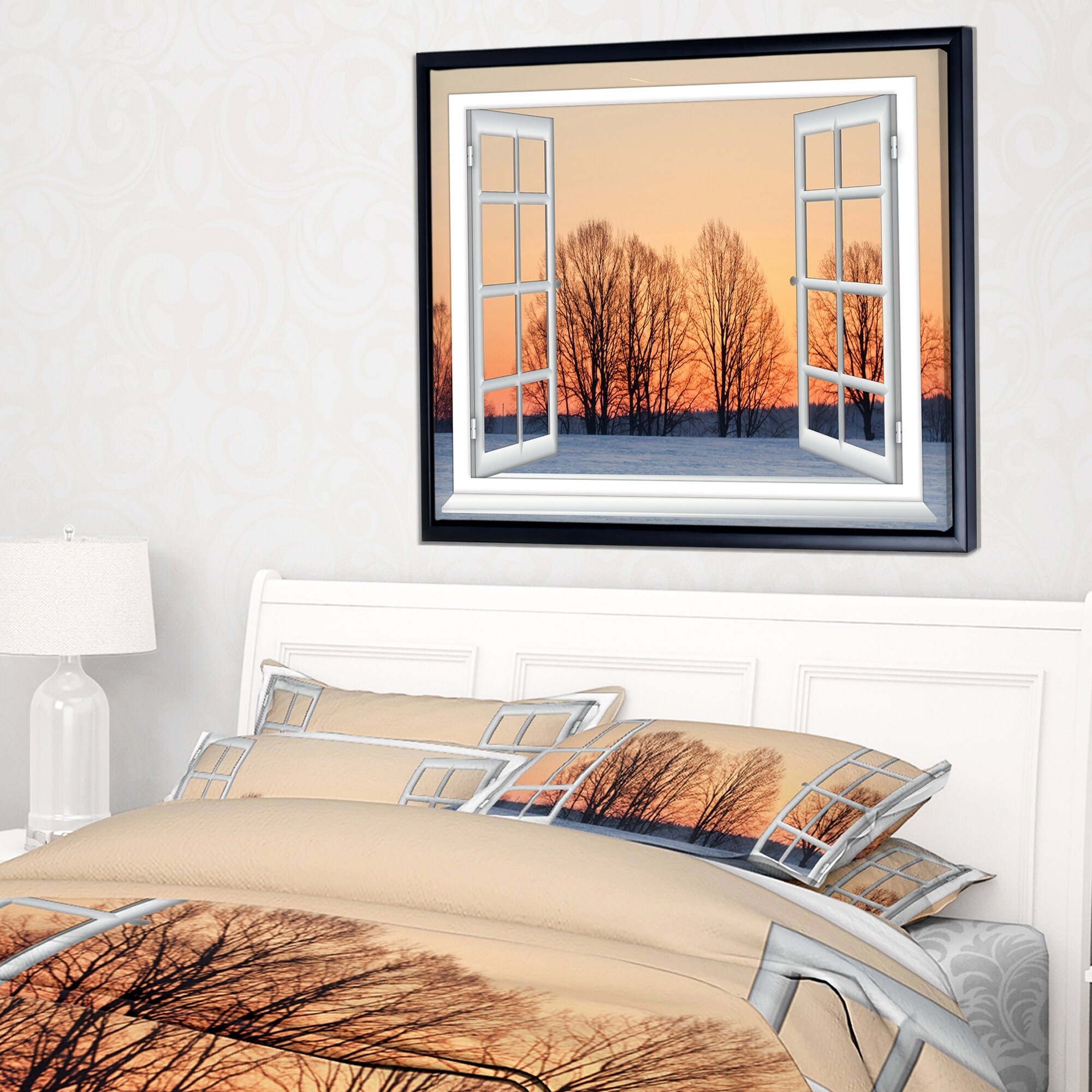 Designart "Open Window to Snowy Sunset" Landscape Framed Canvas Art Print