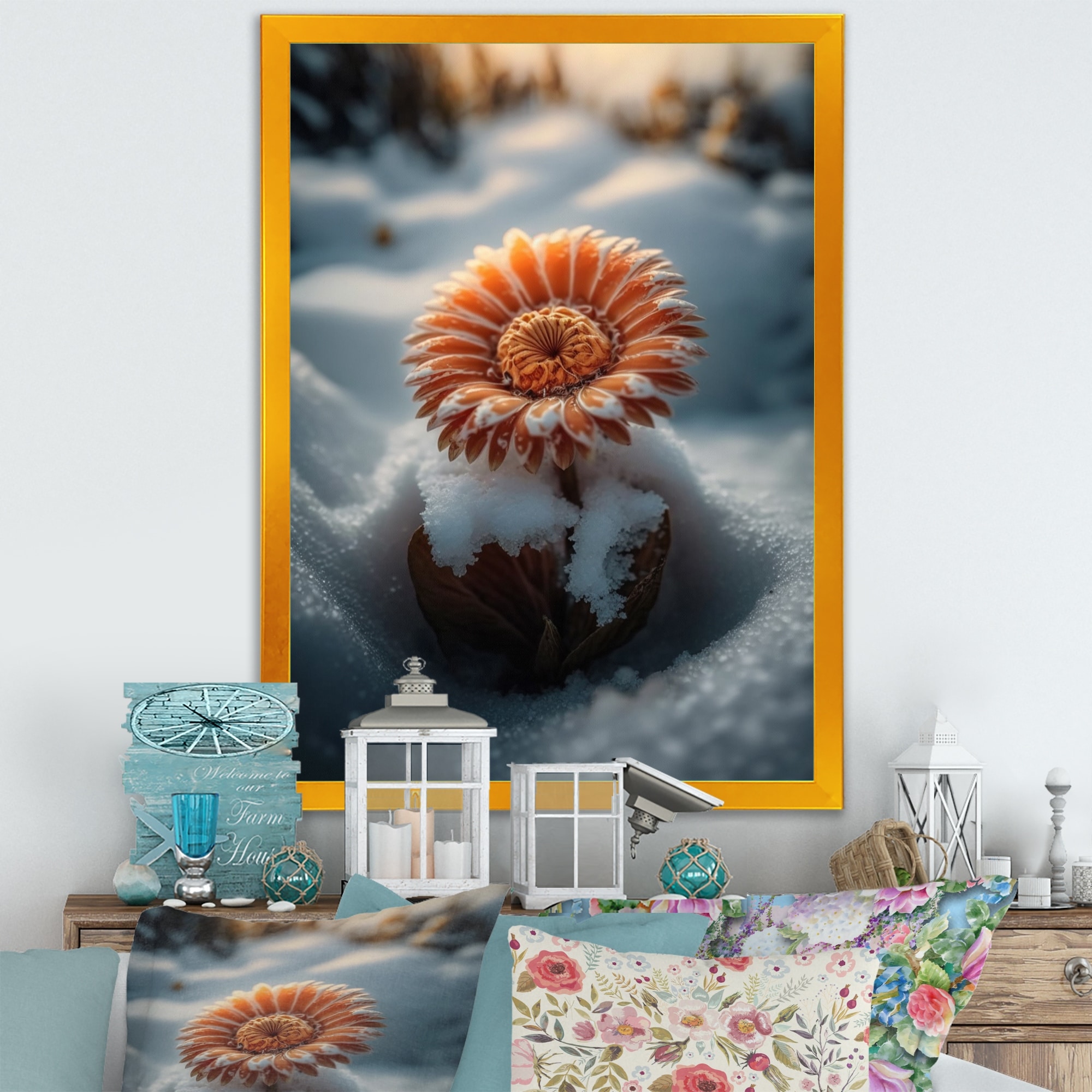Designart "A Blooming Orange Dahlia Flower in Winter I" Floral & Botanical Framed Canvas Art Print