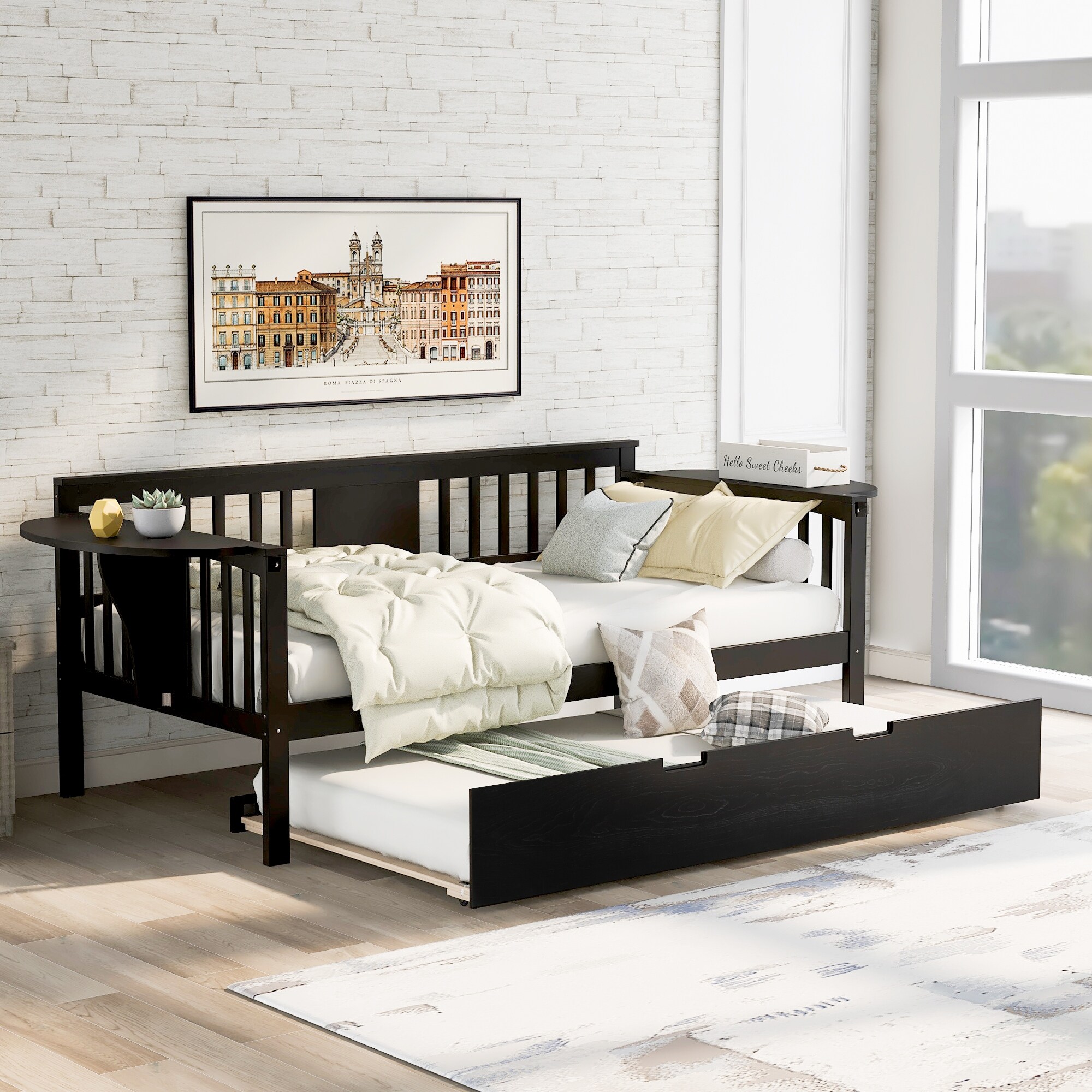Twin Size Daybed with Trundle and Foldable Shelves on Both Sides, Wood Frame Sofa Bed Daybed with Guardrail