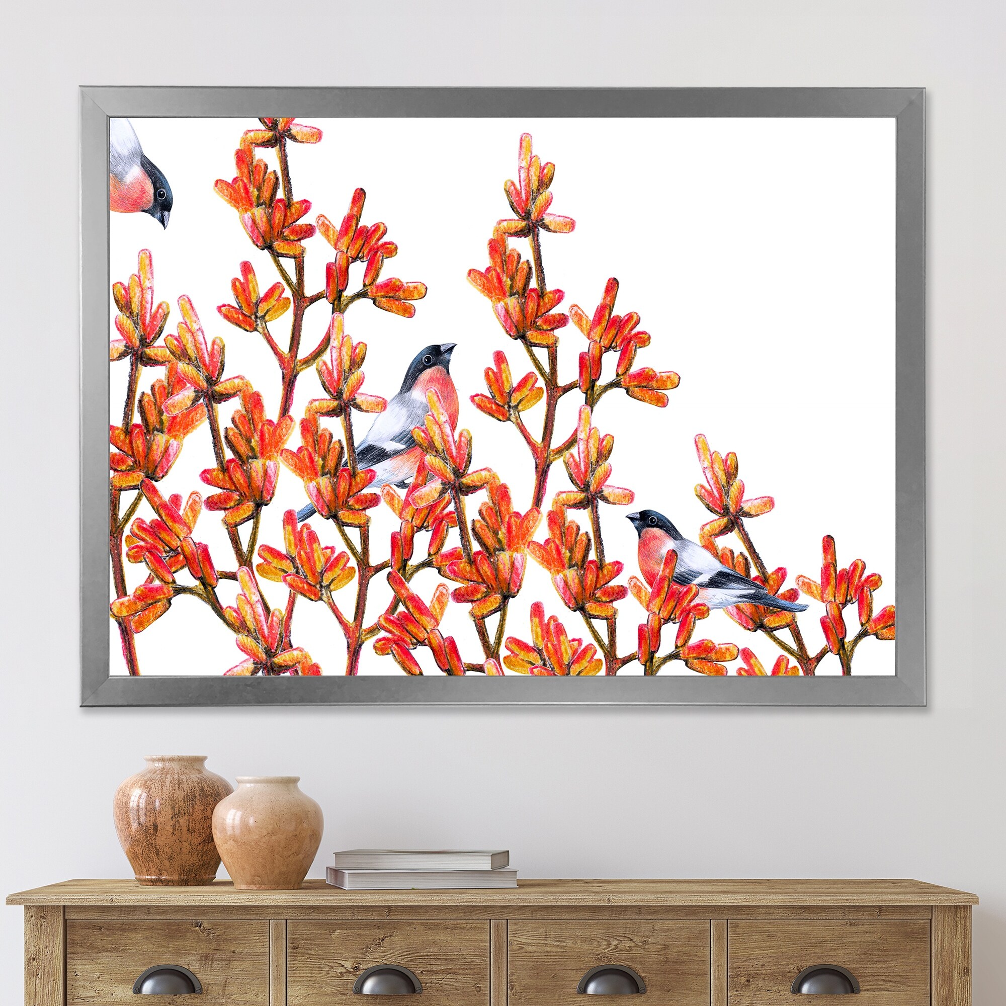 Designart "Flock of Bullfinches Birds on Orange Branches" Traditional Framed Art Print