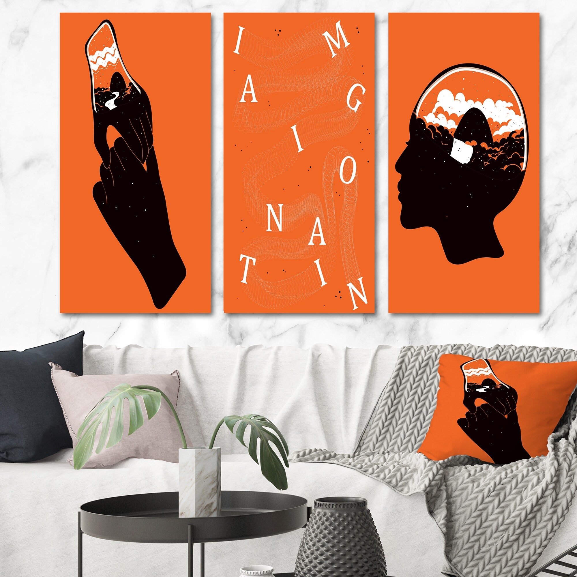Designart 'Imagination Vintage Retro Orange Designs I' Mid-Century Modern Art Set of 3 Pieces