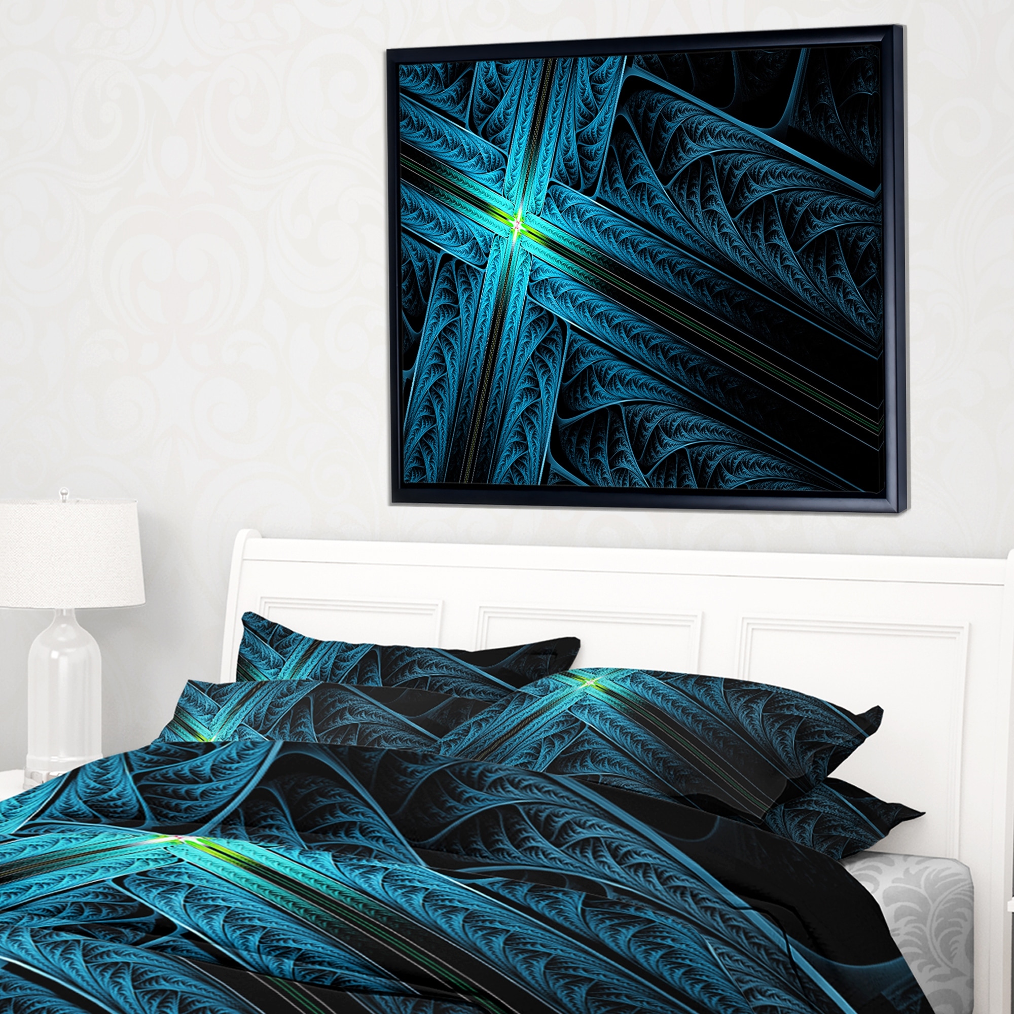 Designart "Turquoise Fractal Cross Design" Abstract Framed Canvas Art Print