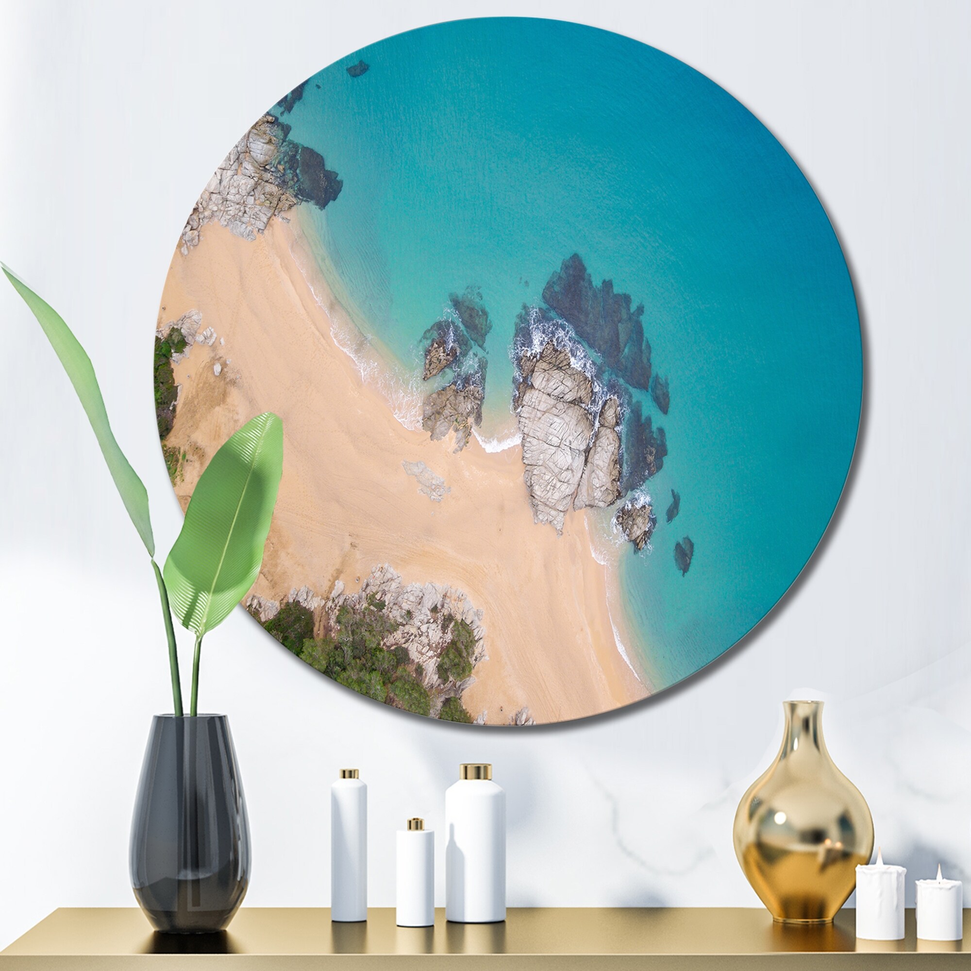 Designart 'Aerial Views of the Rocks in Sea on A Sunny Day' Nautical & Coastal Metal Circle Wall Art
