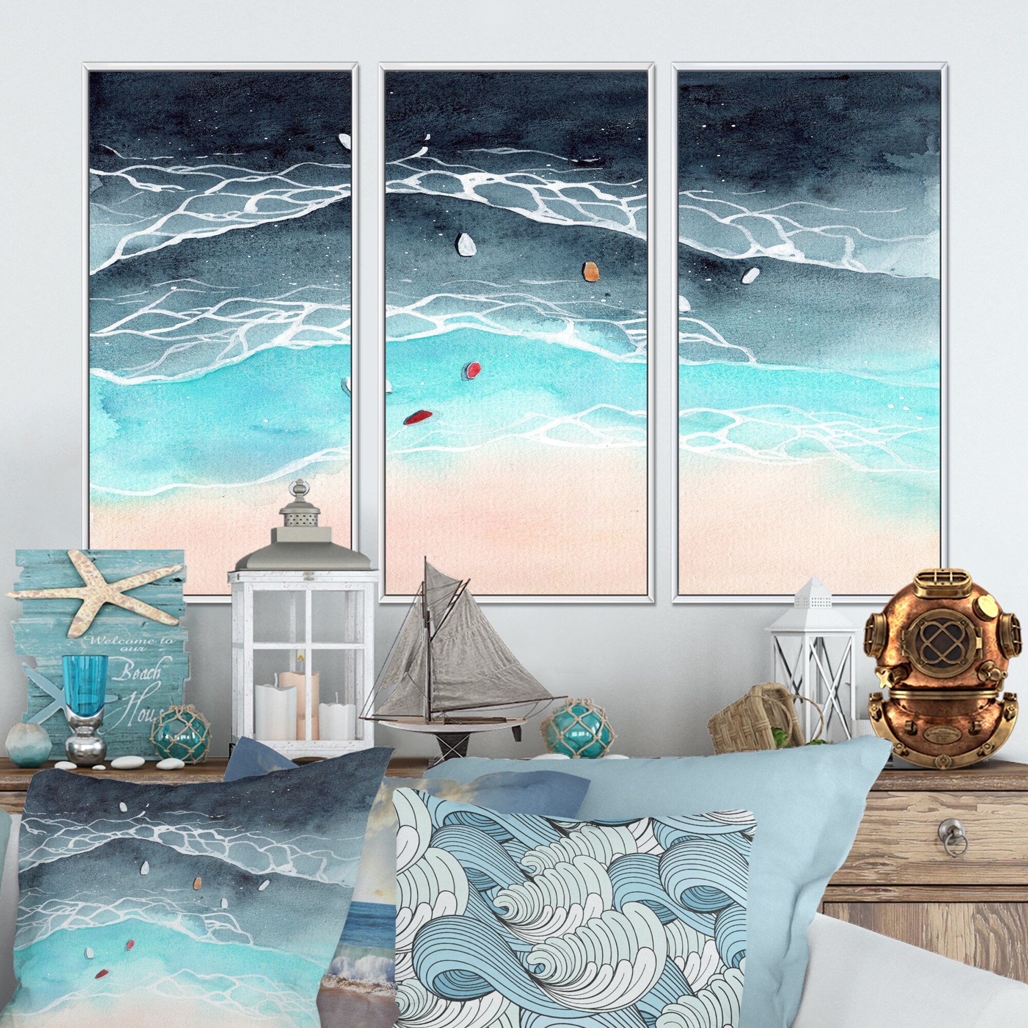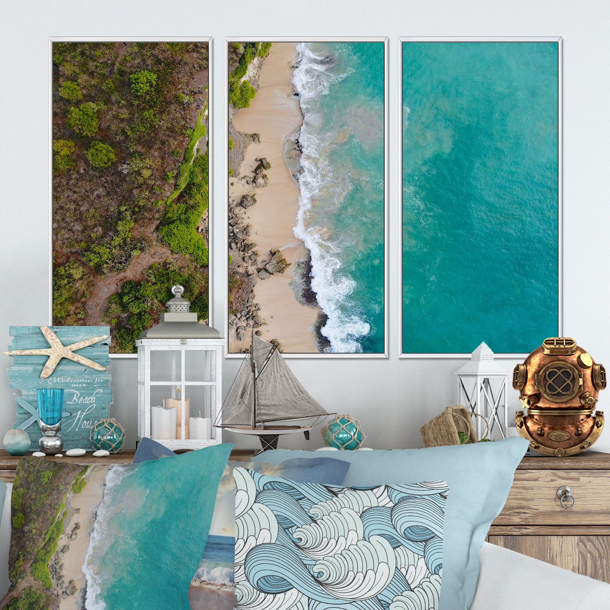 Designart "Aerial View on Tropical Ocean Waves" Nautical & Coastal Framed Canvas Wall Art Set of 3 - 4 Colors of Frames