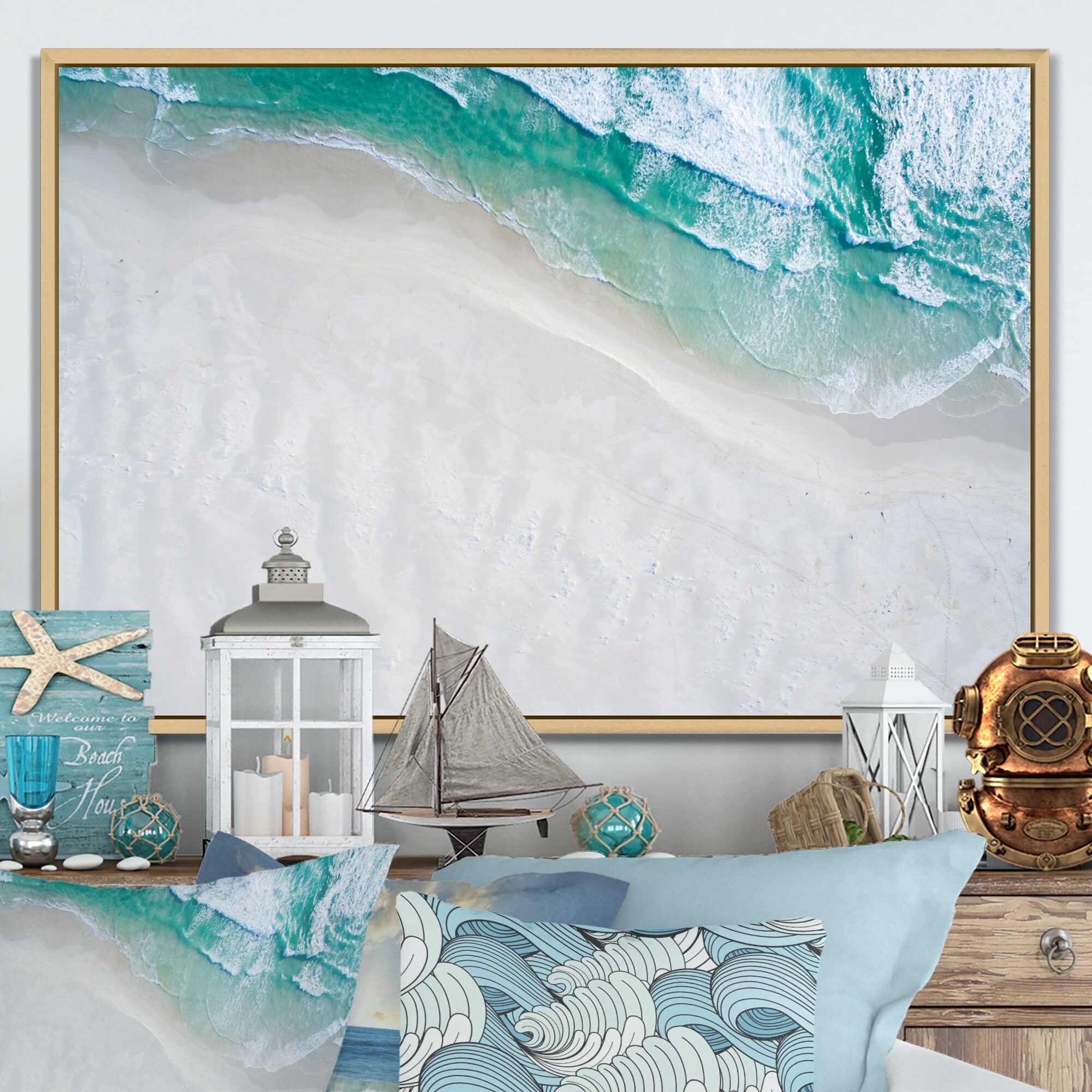 Designart "Turquoise Tropical Beach Aerial View II" Nautical & Coastal Framed Canvas Wall Art Print