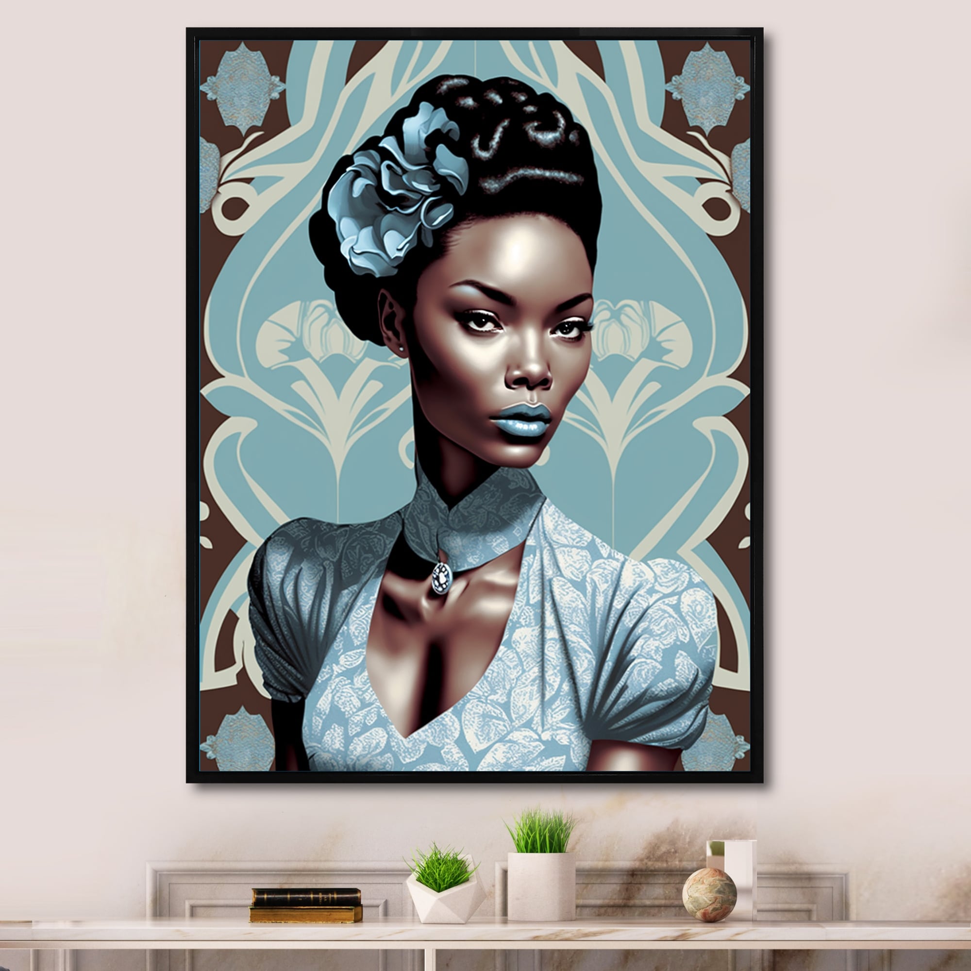 Designart "Blue Fashion Portrait of African American Woman" Modern Framed Canvas Wall Art Print