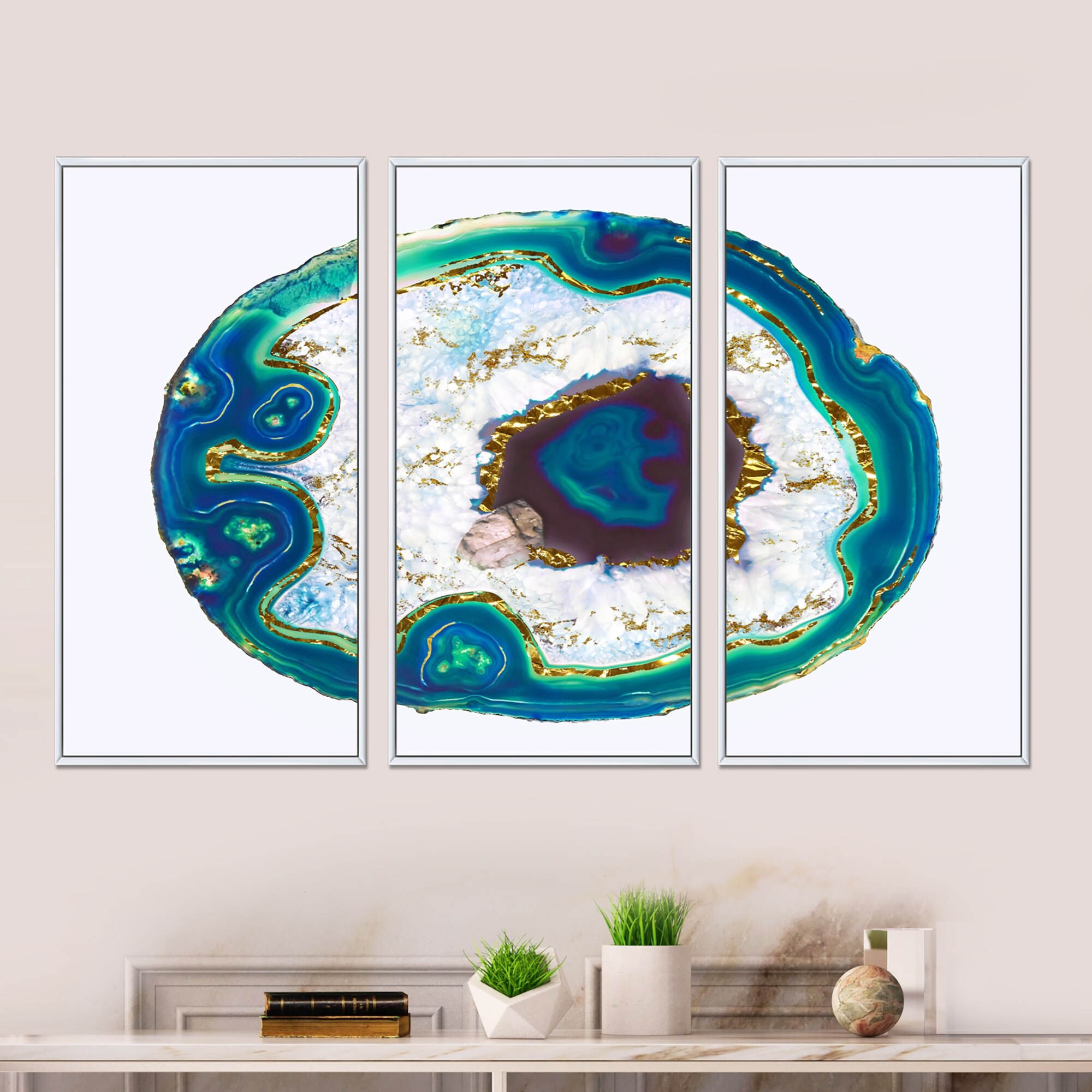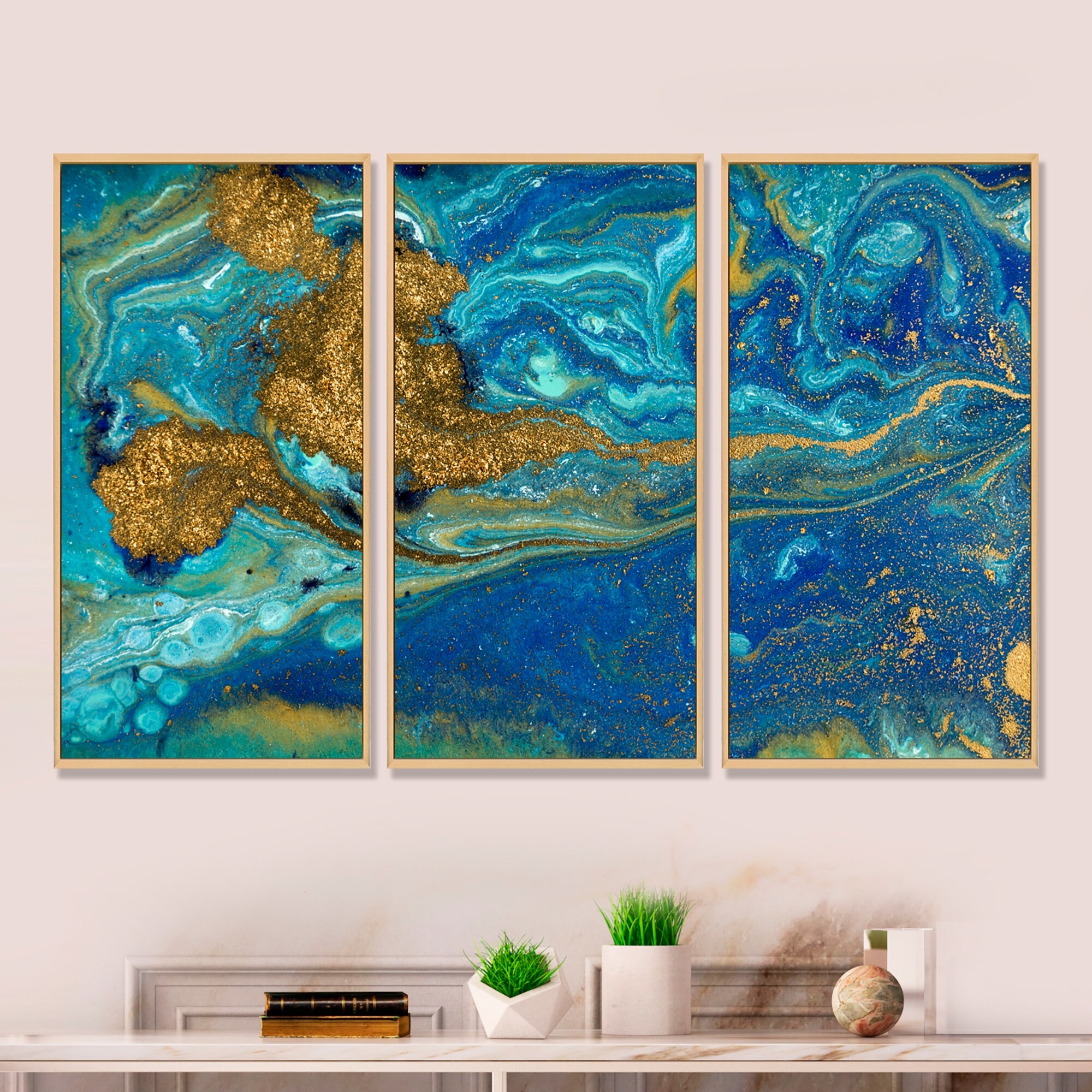 Designart "Crystal Blue Golden Agate" Glam Framed Art Set of 3 - 4 Colors of Frames