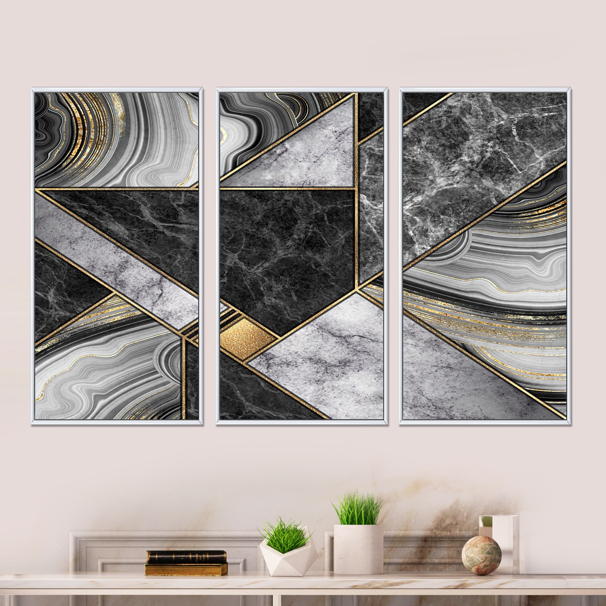 Designart "Marble Granite Agate With Touches of Gold" Modern Framed Artwork Set of 3 - 4 Colors of Frames