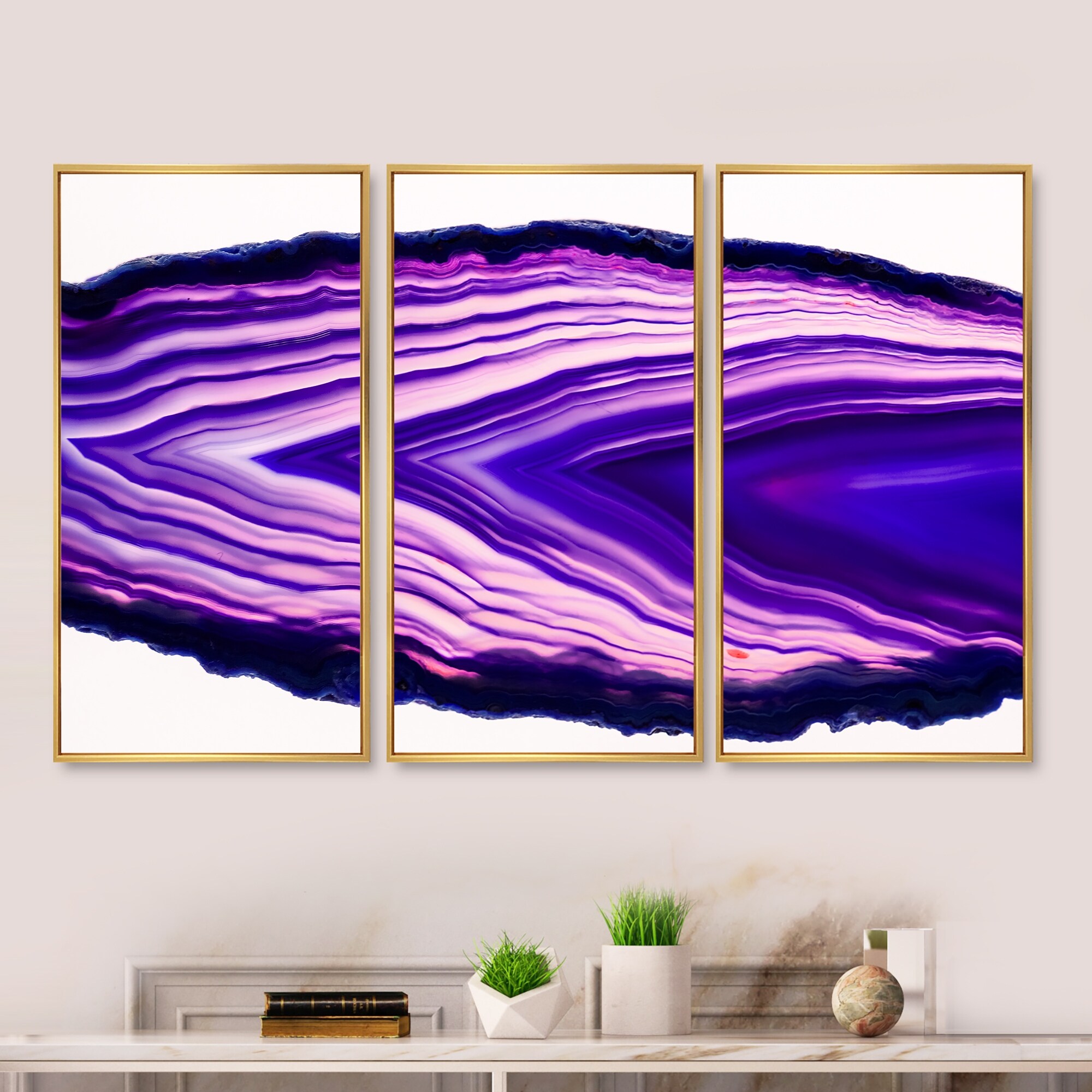 Designart "Agate beautiful Purple slices and texture" Stone Framed Canvas Wall Art Set of 3 - 4 Colors of Frames