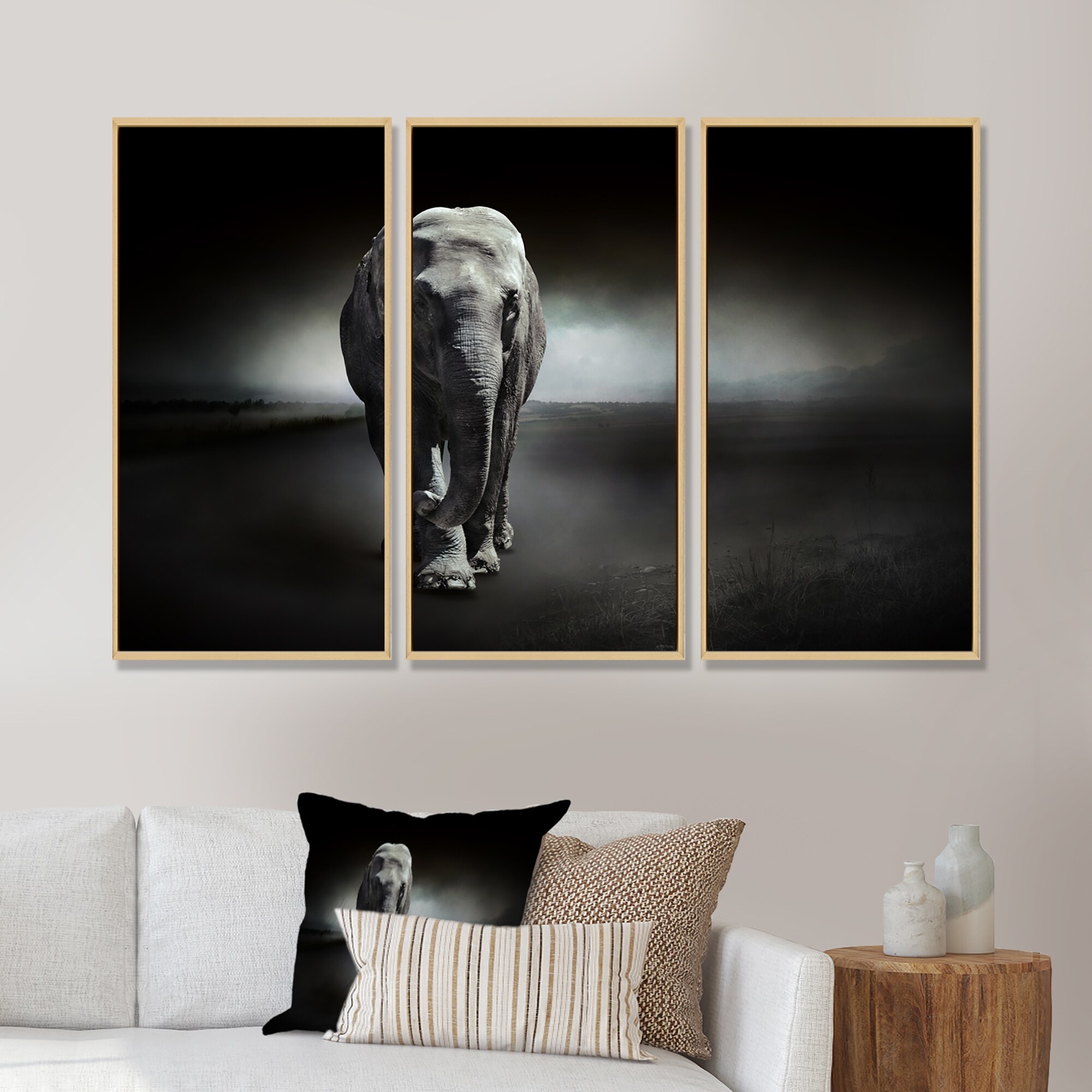 Designart "Large Elephant on Black" Animal Framed Art Prints Set of 3 - 4 Colors of Frames