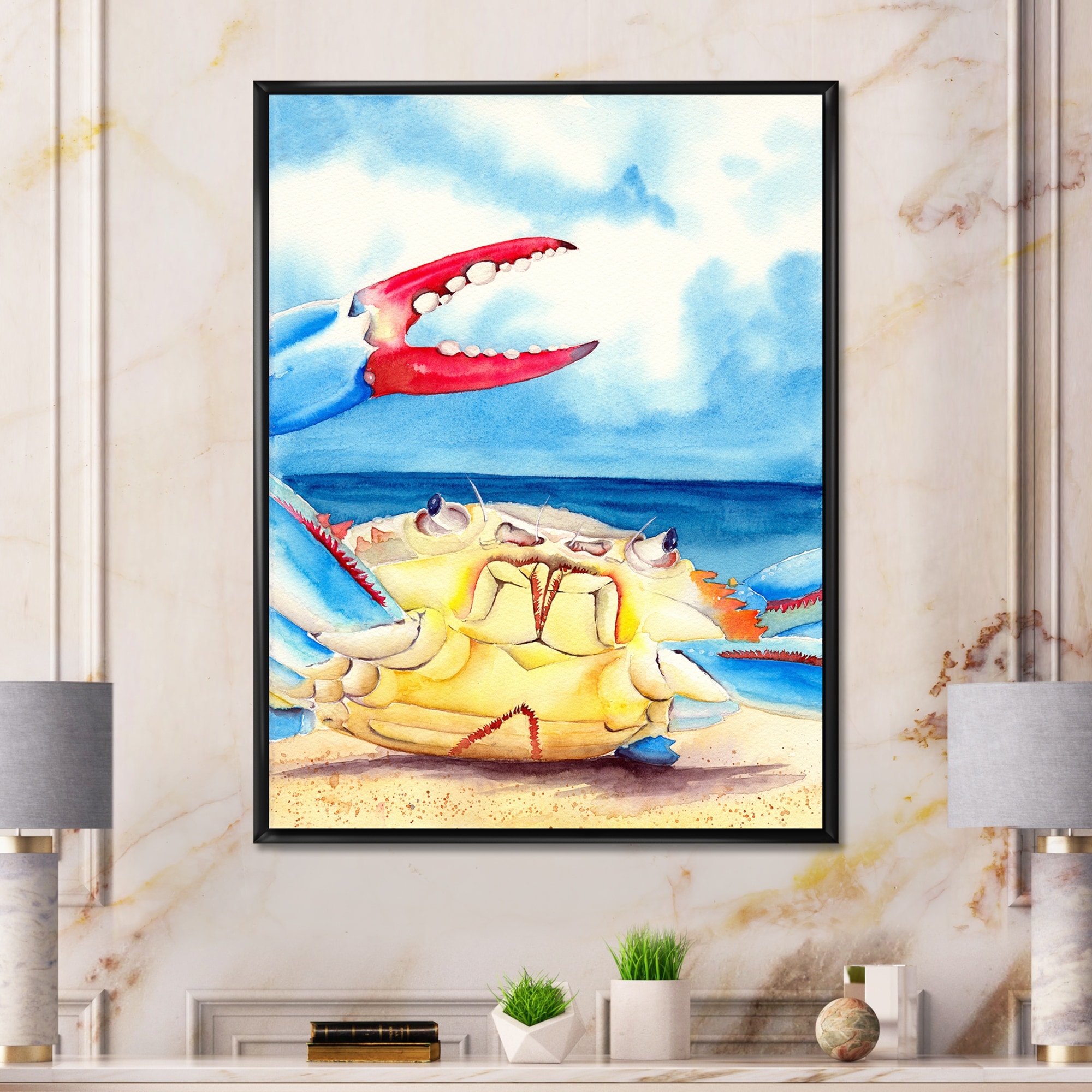 Designart "Colorful Blue Crab on A Sand Seashore" Nautical & Coastal Framed Canvas Wall Art Print