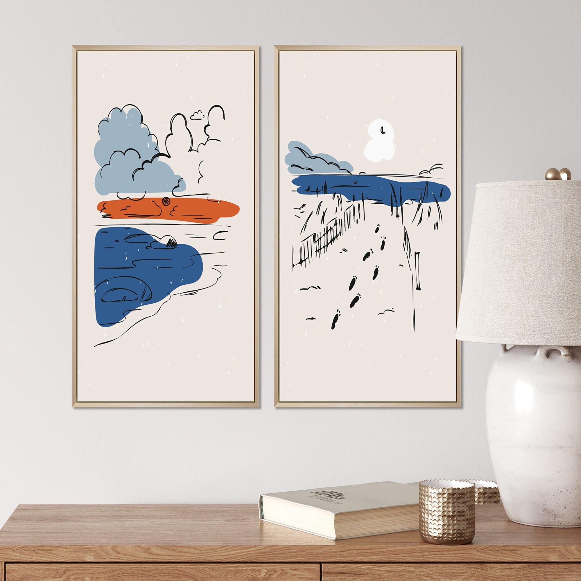 Designart "Blue And Orange Retro Landscapes I" Landscapes Framed Art Set of 2 Pieces
