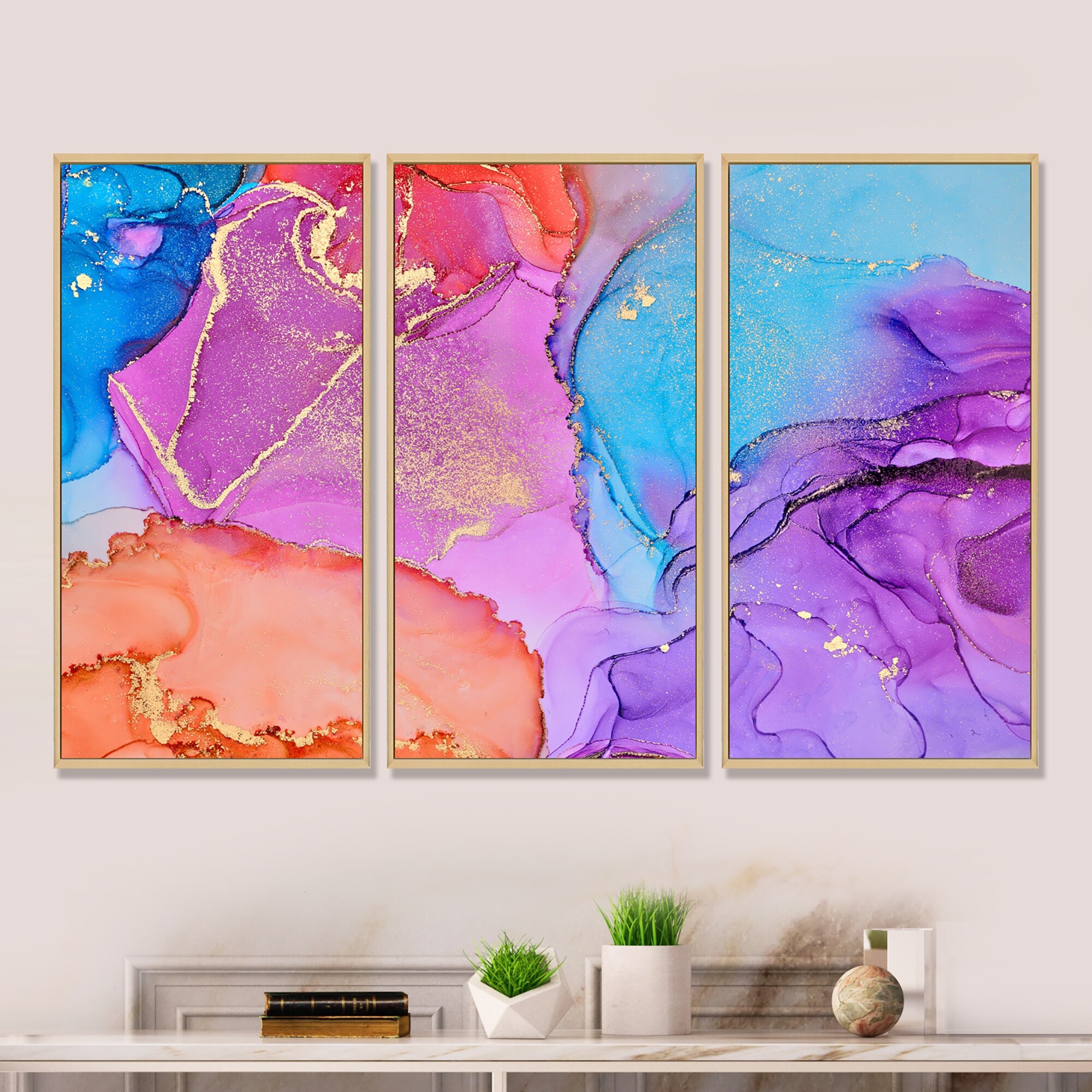 Designart "Purple And Blue Luxury Abstract Fluid Art XI" Modern Framed Wall Decor Set of 3 - 4 Colors of Frames