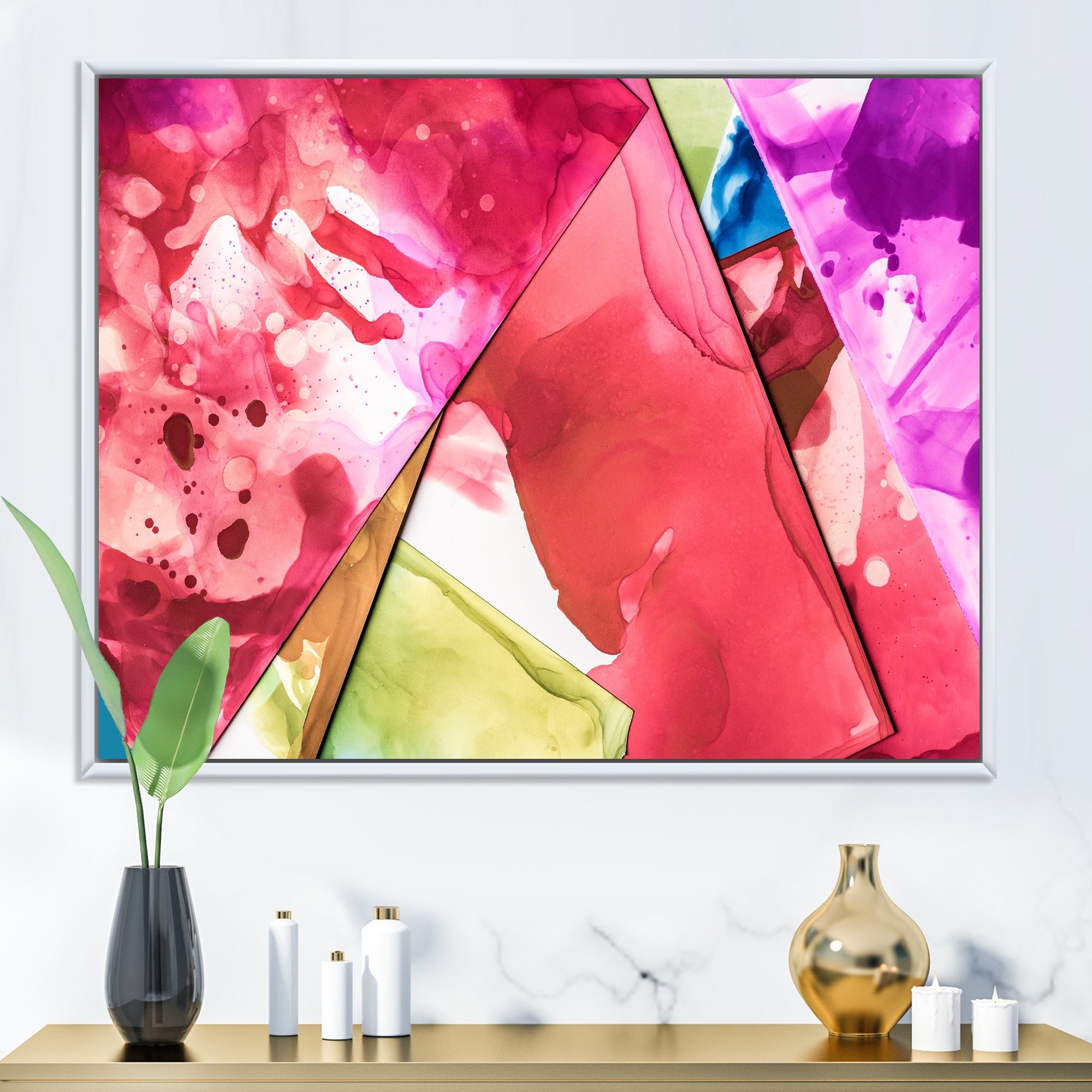 Designart "Red Purple Splashes Ink" Abstract Framed Canvas Wall Art