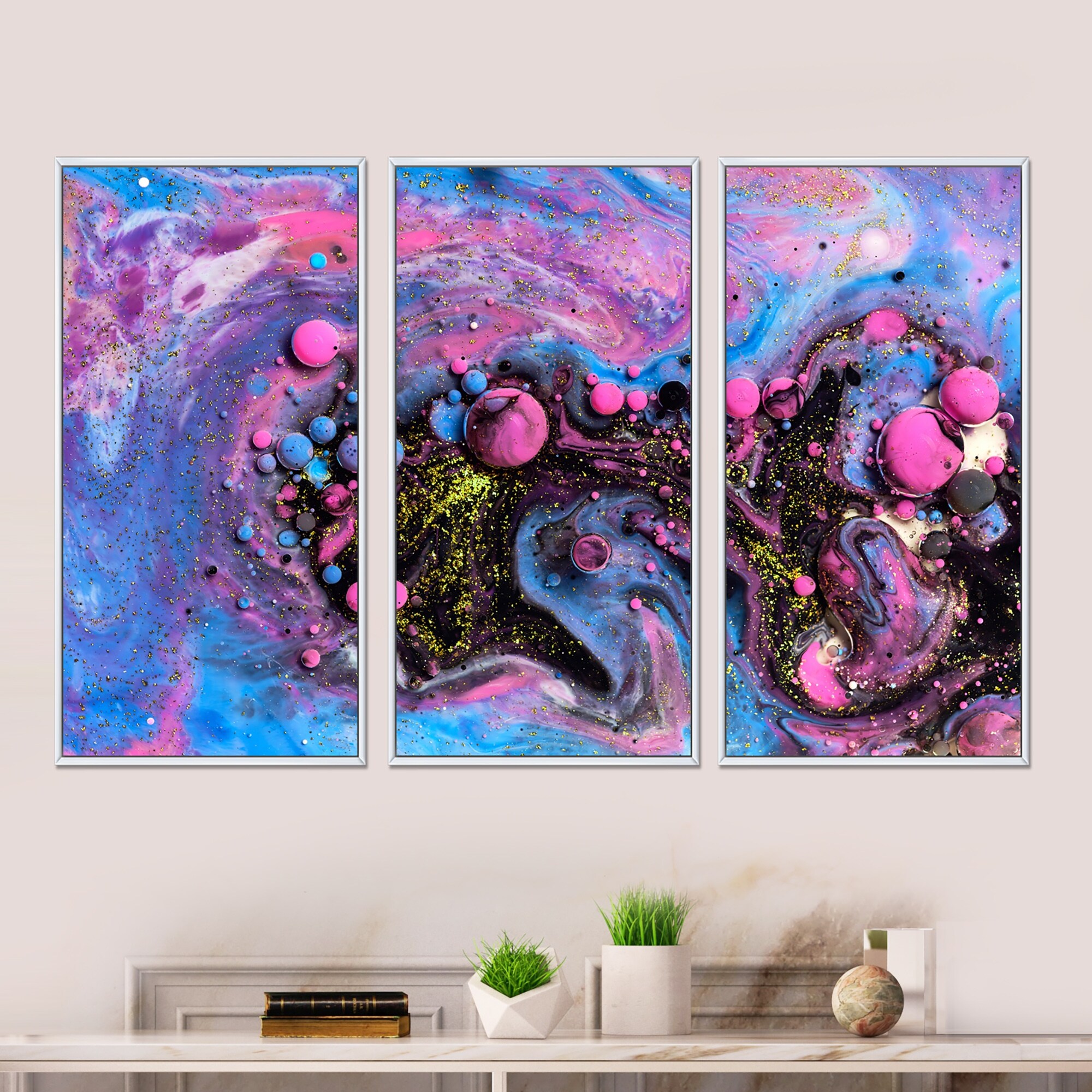 Designart "Pink And Blue Luxury Abstract Fluid Art" Modern Framed Artwork Set of 3 - 4 Colors of Frames