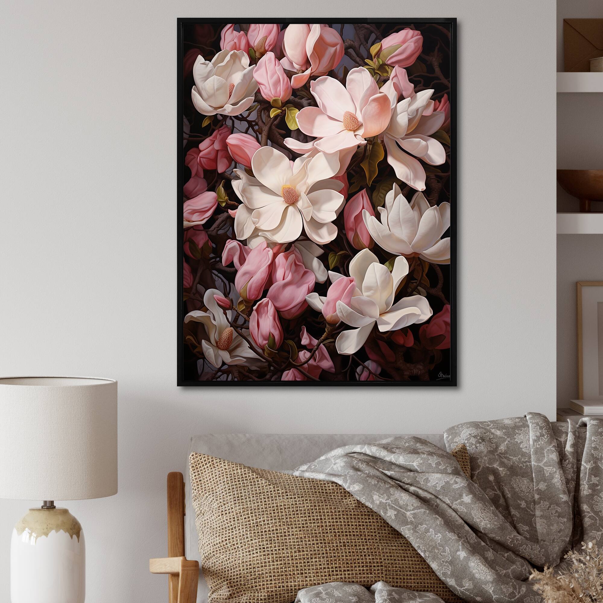 Designart "Pink White Magnolias Magnolia Embrace" Magnolias Framed Wall Art Prints