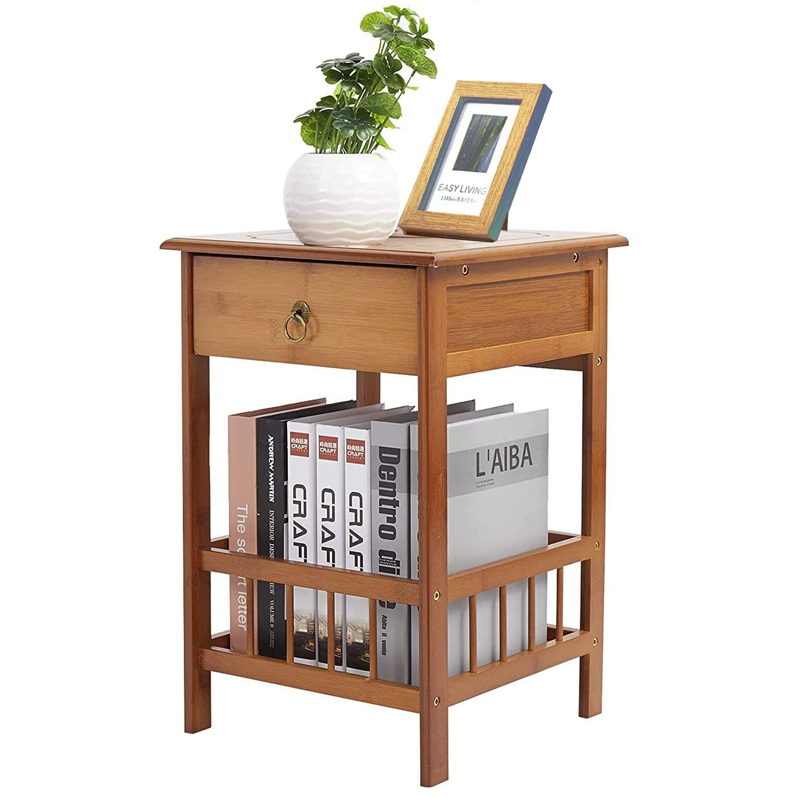 Bamboo End Side Table Nightstand with Drawer for Bedroom Bedside (Brown, 2 Tier)
