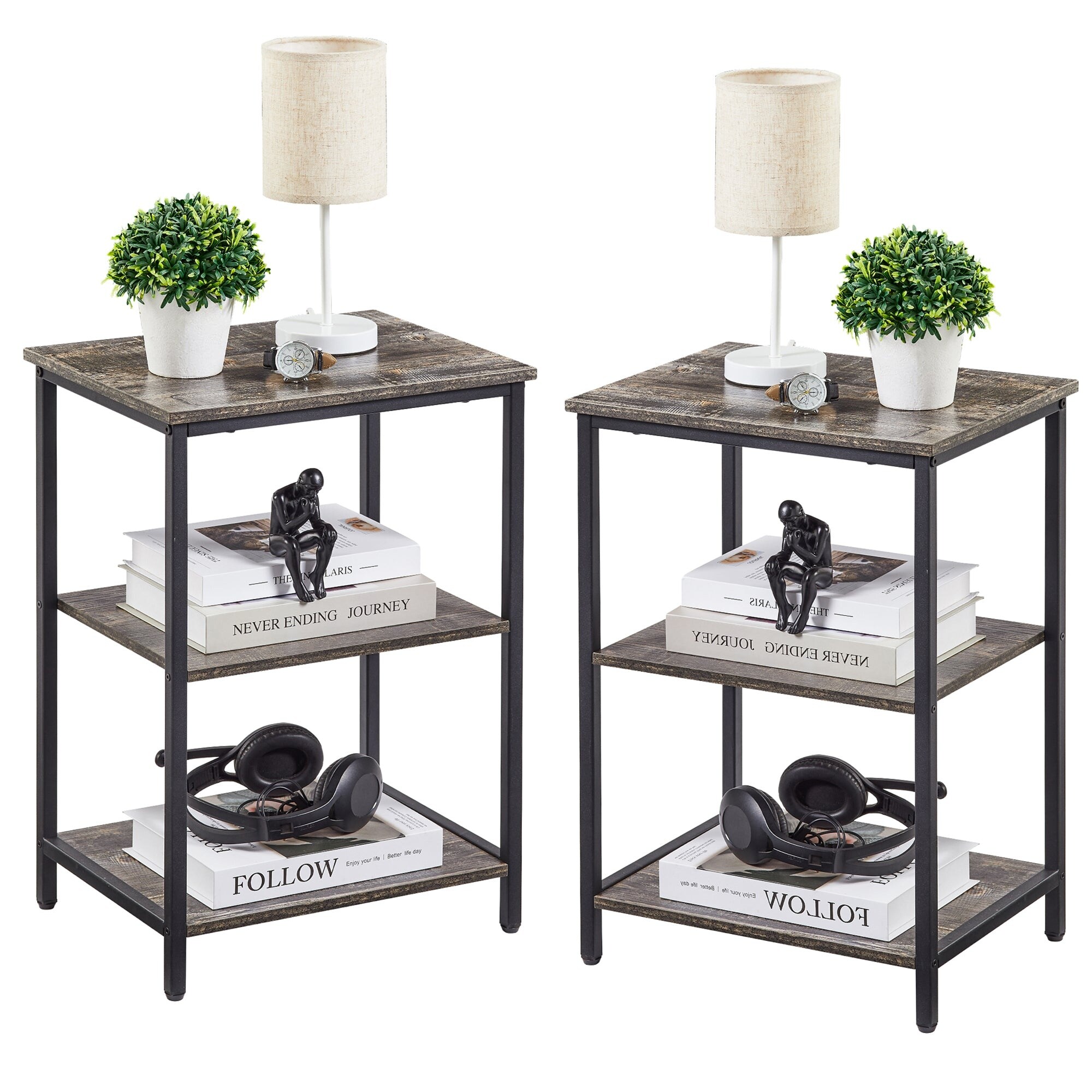 Set of 2 End Table With Wood Storage Shelf, 3-Tier Bedside Sofa Side End Table Storage Display Shelf