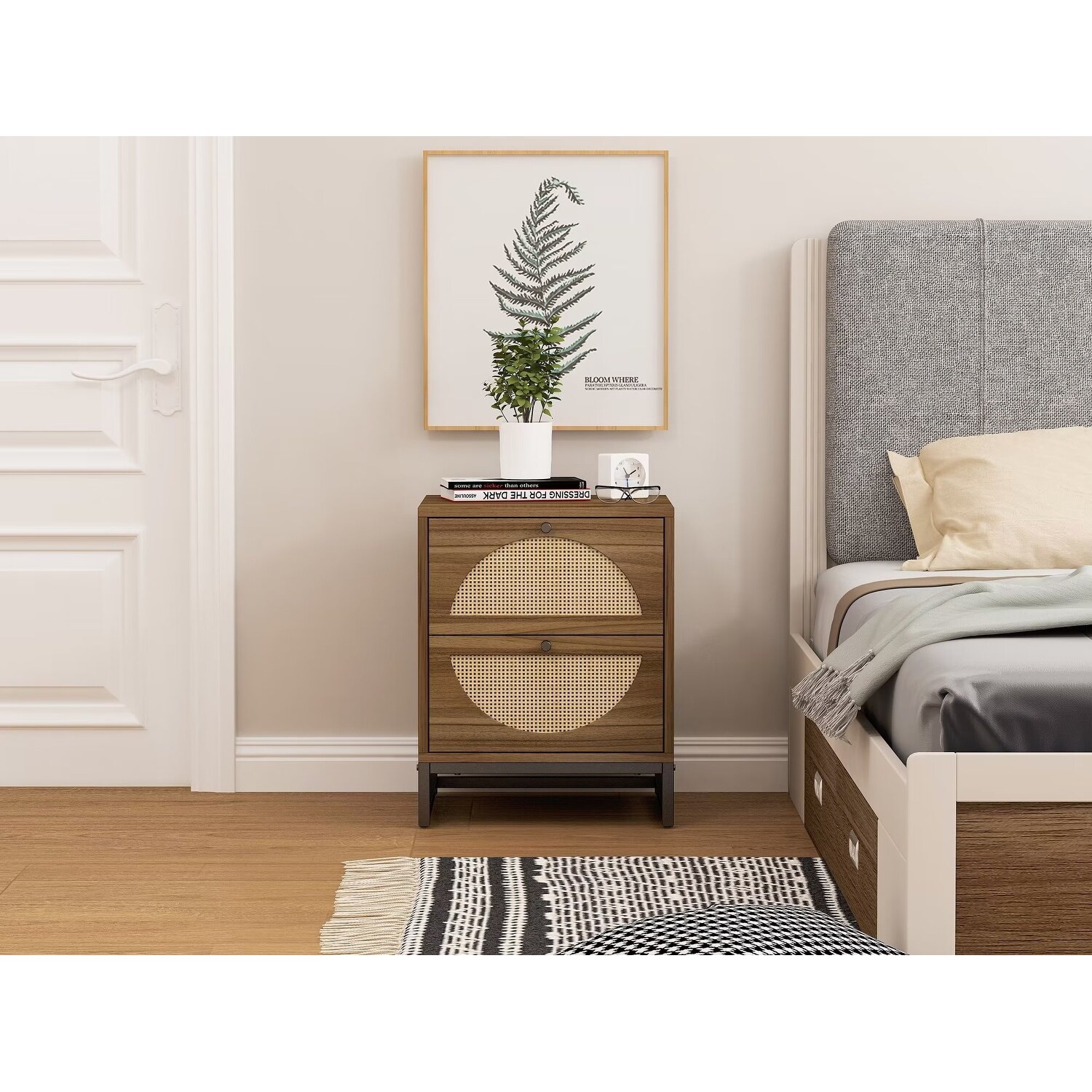 Natural Rattan, 2 Drawer Side Table, Nightstand Bedroom Storage Drawer Bedside, End Table for Living Room