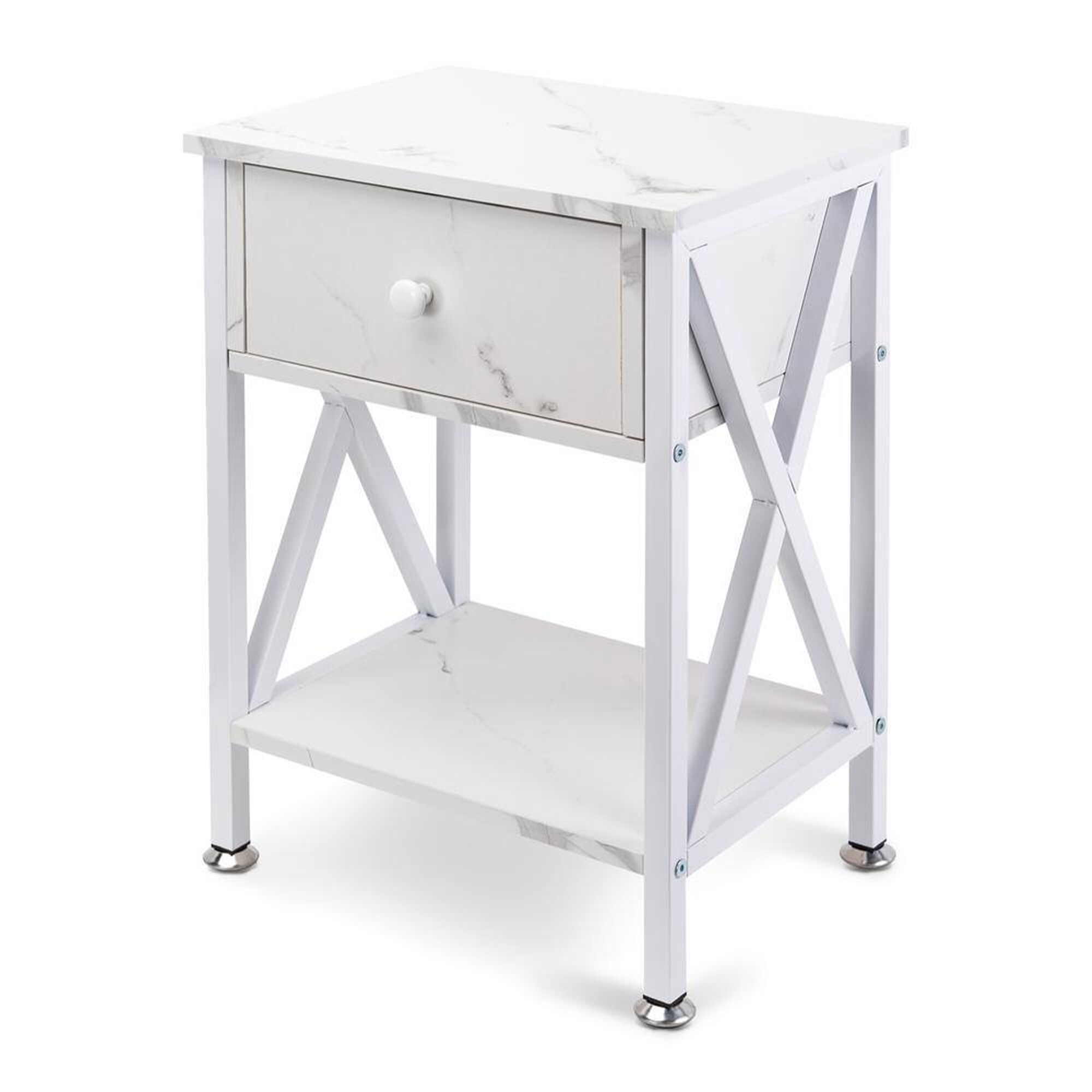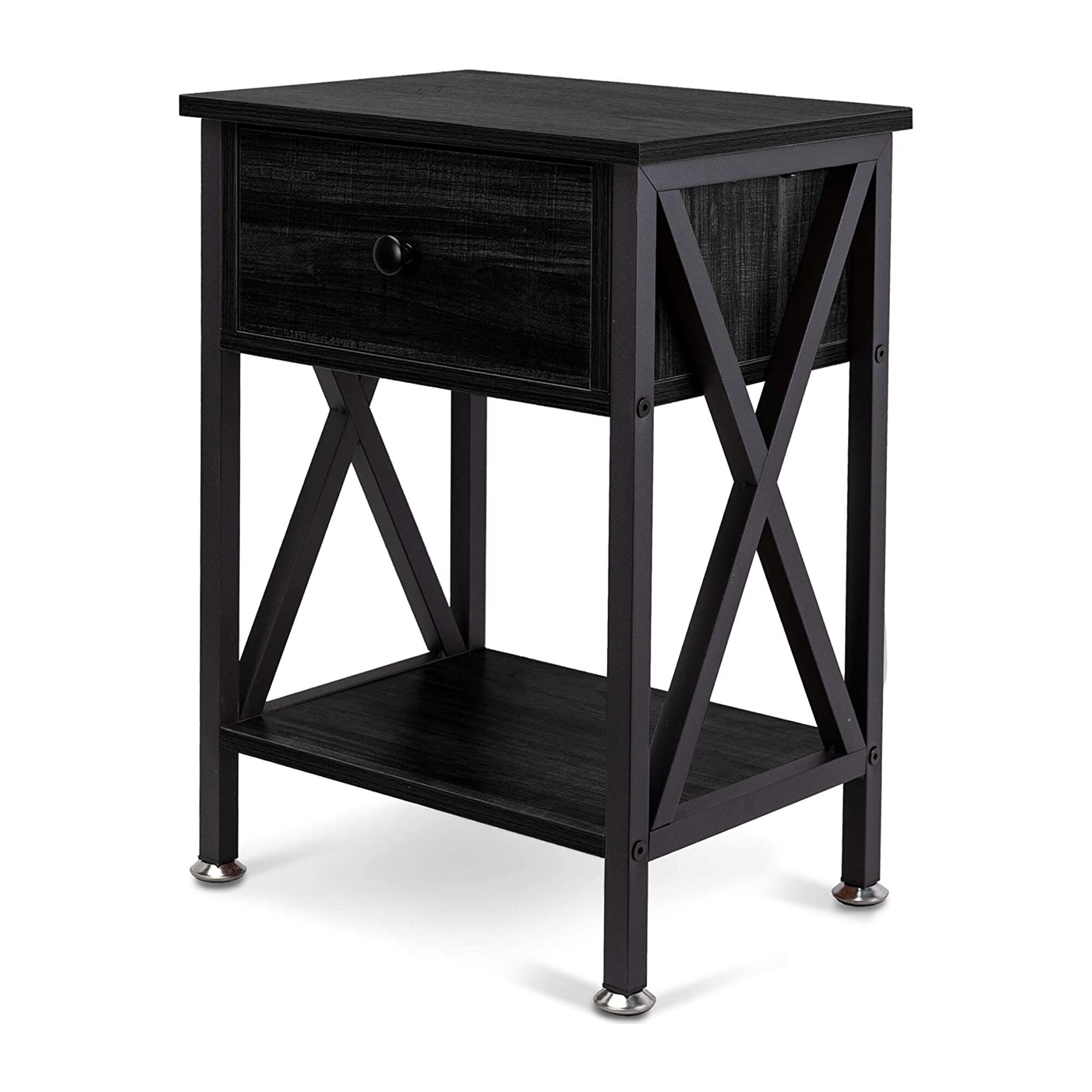 Classic Modern X-shaped MDF and metal Nightstand with Drawer and Open Storage Shelves, Bedside End Table for Bedroom Livingroom.