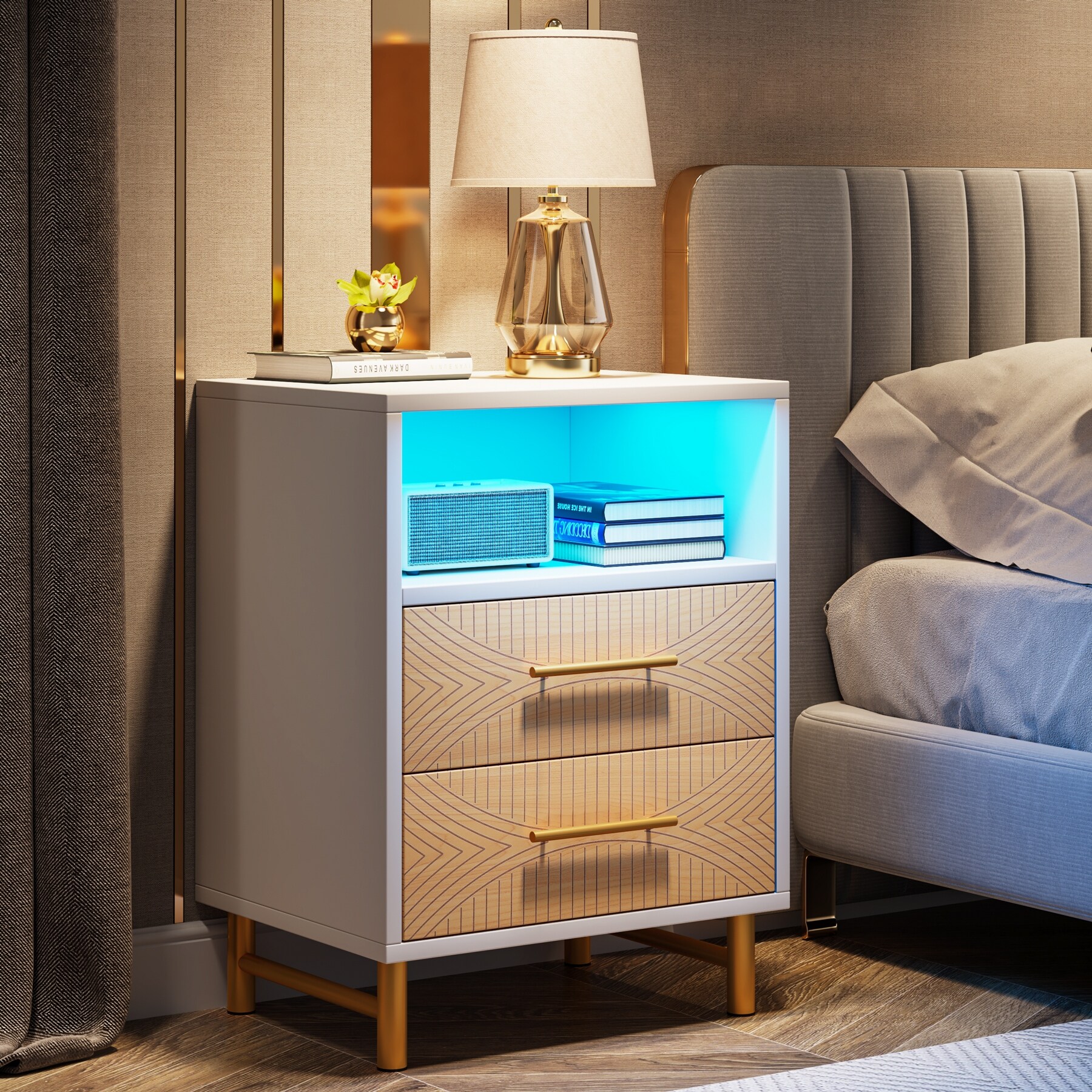 Nightstand with 8 color LED Lighting,Bedside End Table with Drawers and Open Storage Area