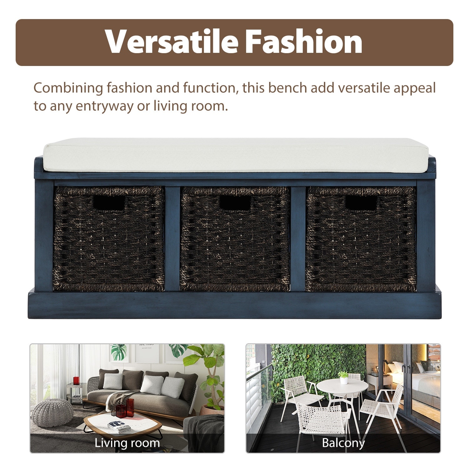 Storage Bench Entryway Bench with 3 Removable Classic Rattan Basket Entryway Bench with Removable Cushion