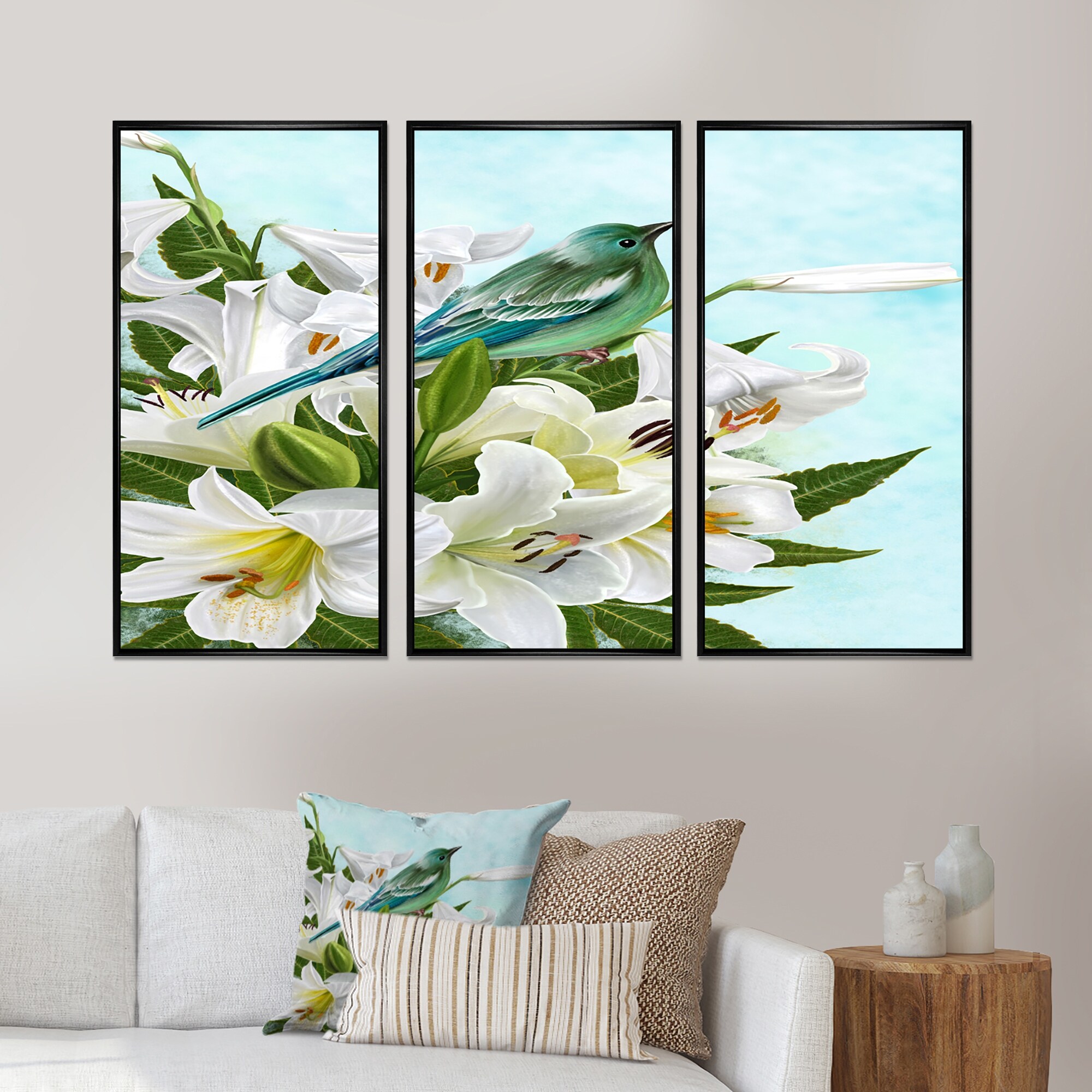 Designart "Little Blue Bird With White Flowers Lilies" Cabin & Lodge Framed Wall Decor Set of 3 - 4 Colors of Frames