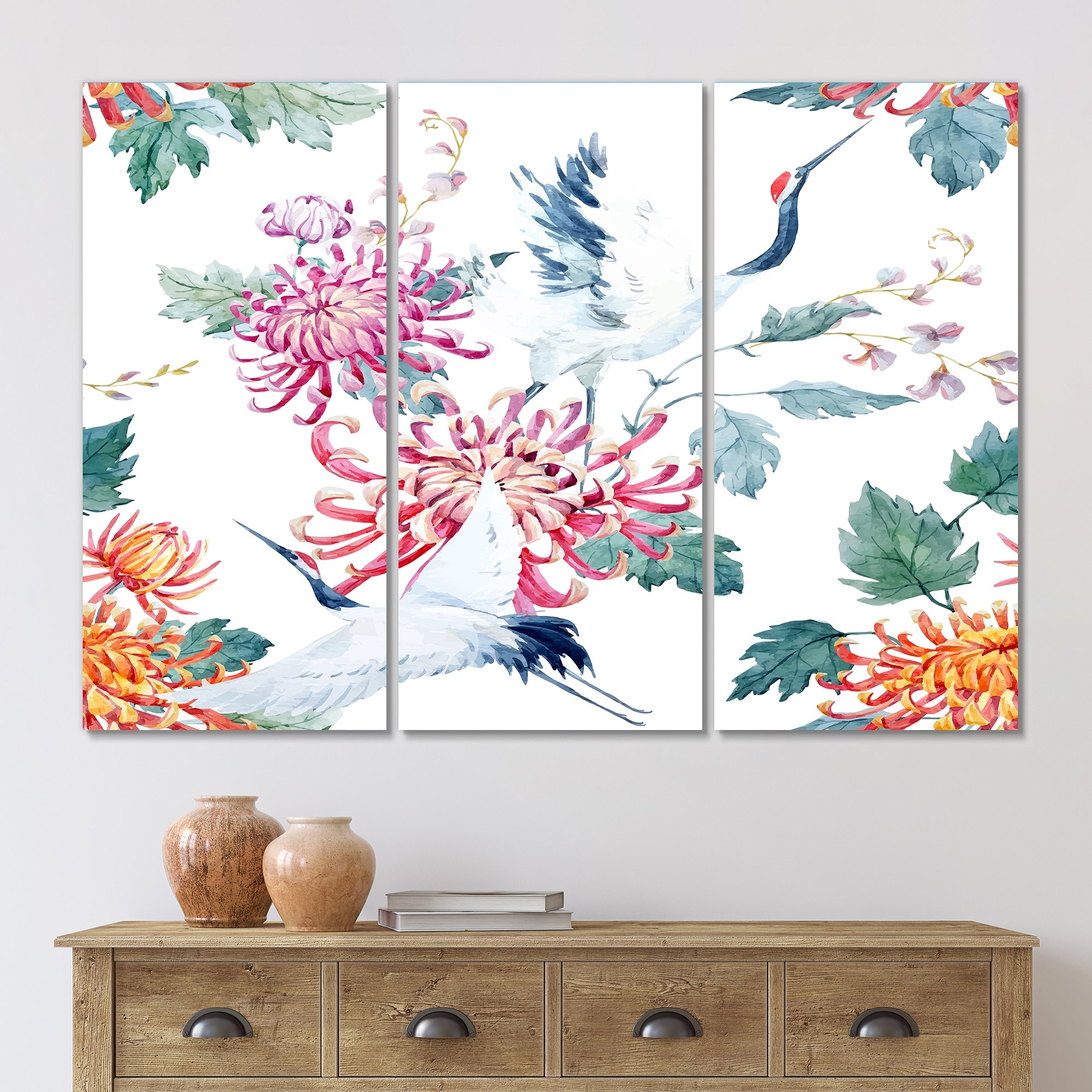 Designart "Crane Bird With Flowers And Plants" Patterned Canvas Wall Art Print